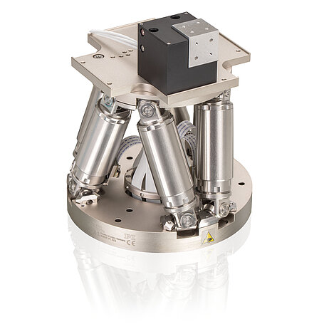 ヘキサポッドのパラレルキネマティックデザインにより、6自由度すべてにおいて高いシステム剛性を実現しています。ヘキサポッドの足にはブラシレスDCモーターが搭載されており、移動範囲は±17mm、傾斜範囲は±21mmまで可能です。ピボットポイントはソフトウェアを使って自由に定義することができ、光軸、焦点、ビームウエストなどの望ましい位置を中心に回転させることができます。