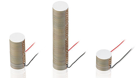 The actuators are made of round PICMA® Chip actuators that are glued together. This technology allows flexible scaling and fast production – with correspondingly short short delivery times. The gluing procedure does not impair the high reliability and long lifetime of the PICMA® actuators. As standard, they are provided with 100 mm stranded wire connections.