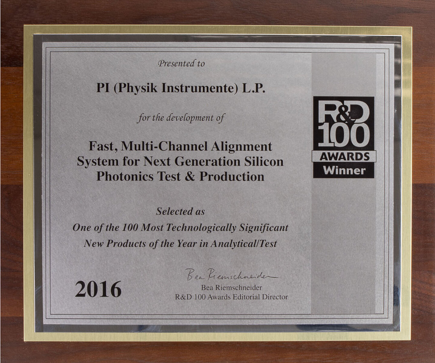 シリコンフォトニクスとともに需要が高まっているのが、ナノメーターレベルの精度と、チップの検査や生産における高いスループットです。PI(Physik Instrumente)は、このような用途に対して革新的なソリューションを提供し、分析/テストカテゴリーで、2016年、最高に革新的だった技術開発ベスト100の1つに選ばれました。
