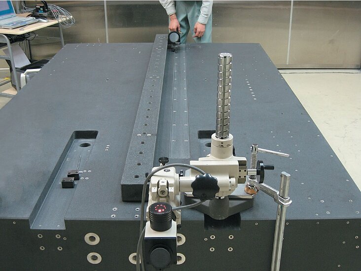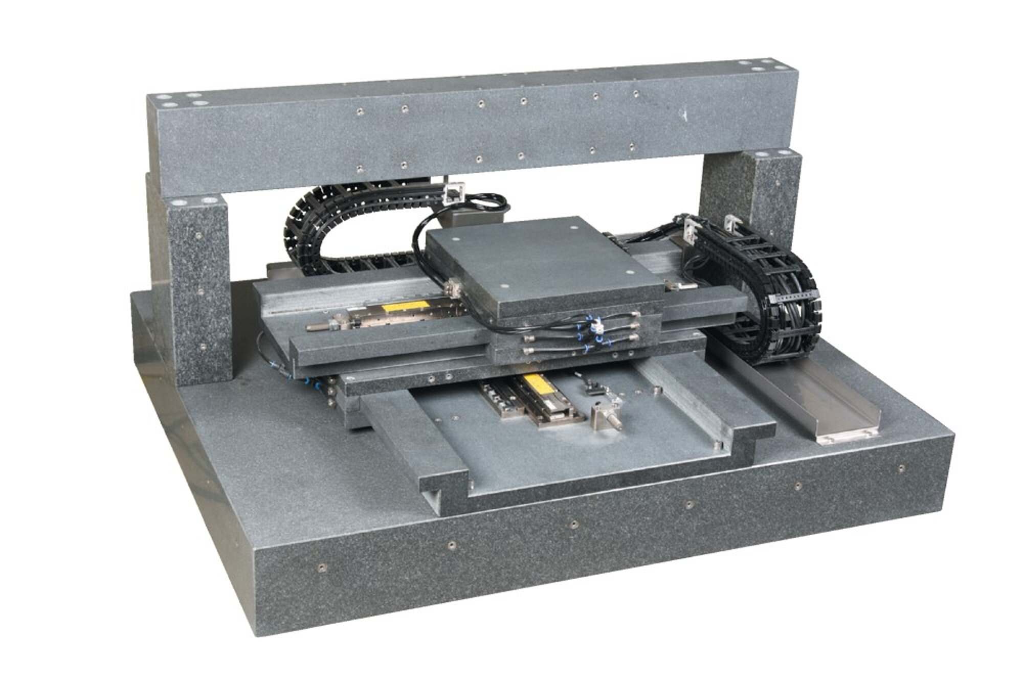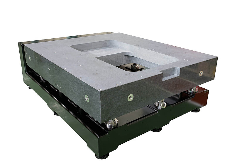 精密位置決めの中でも、特に半導体やFPD製造装置、実装機、検査装置、精密測定器や分析装置の中では、ワークを載せたステージが高速動作し、高精度な位置決めが行われています。そのスピードと精度は年々向上し要求も高くなっています。しかし高速動作や激しい加減速には振動がつきもので、停止後もしばらくは装置内に微妙な振動が残ってしまうことがあります。こうした振動を最小限に抑え、収束時間を短くするために、最も適したグラナイトベースにしたマシンベースが有効で広く使われています。