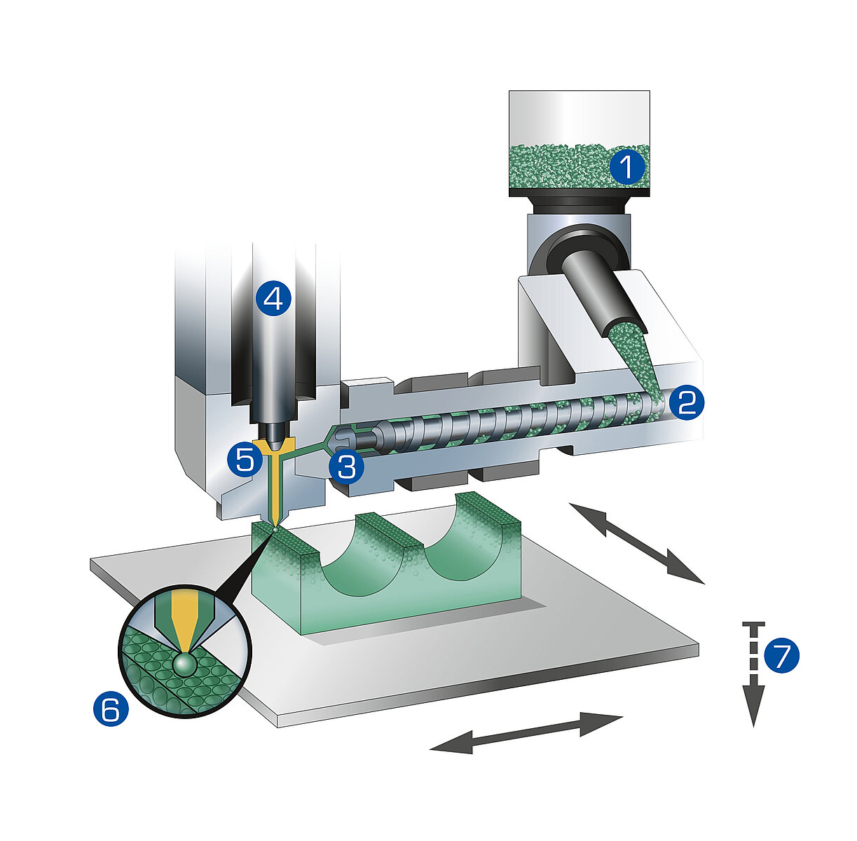 The central process of additive manufacturing is the generation of the droplets at the nozzle of the discharge unit. Piezo actuators convert electrical energy directly into mechanical energy and enable motion with subnanometer resolution. They achieve travel ranges up to approximately one millimeter and high dynamics with frequencies up to several thousand Hertz. The discharge unit on the freeformer currently works with frequencies between 60 and 200 Hz.