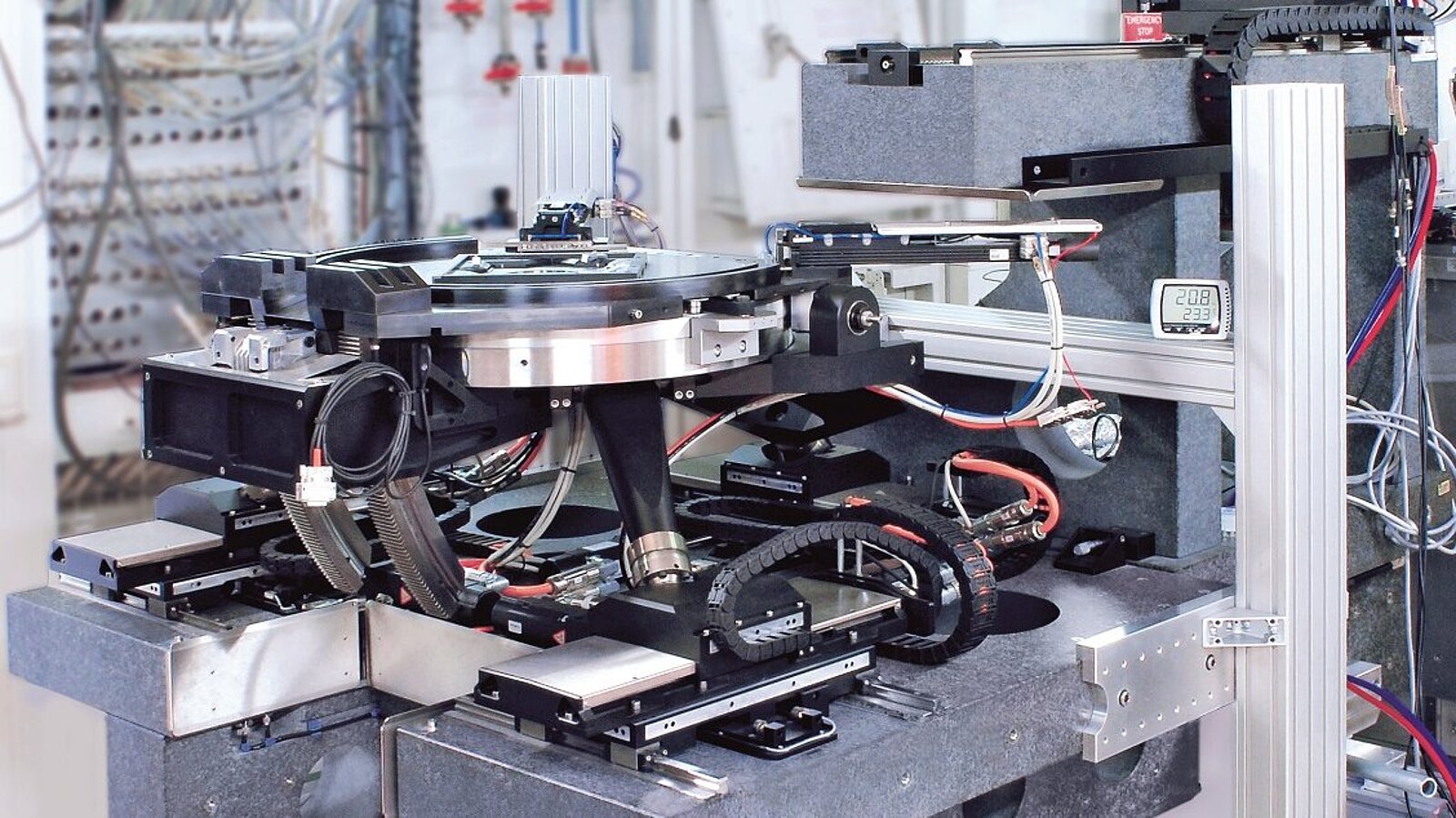 Above, a 360° rotating table enables 0.24 μm absolute flatness deviation only. The angle of the sample relative to the X-ray beam can be adjusted by up to 45° at a resolution of 0.001°. This design has a self-locking rack and pinion drive to remain stable during examination. The actual sample holder, an extremely thin frame carrier, is held magnetically, a flexure joint and air cushion provide optimal parallelism. Two linear stages shift and center the sample holder over 150 mm × 150 mm but do not touch it during operation.