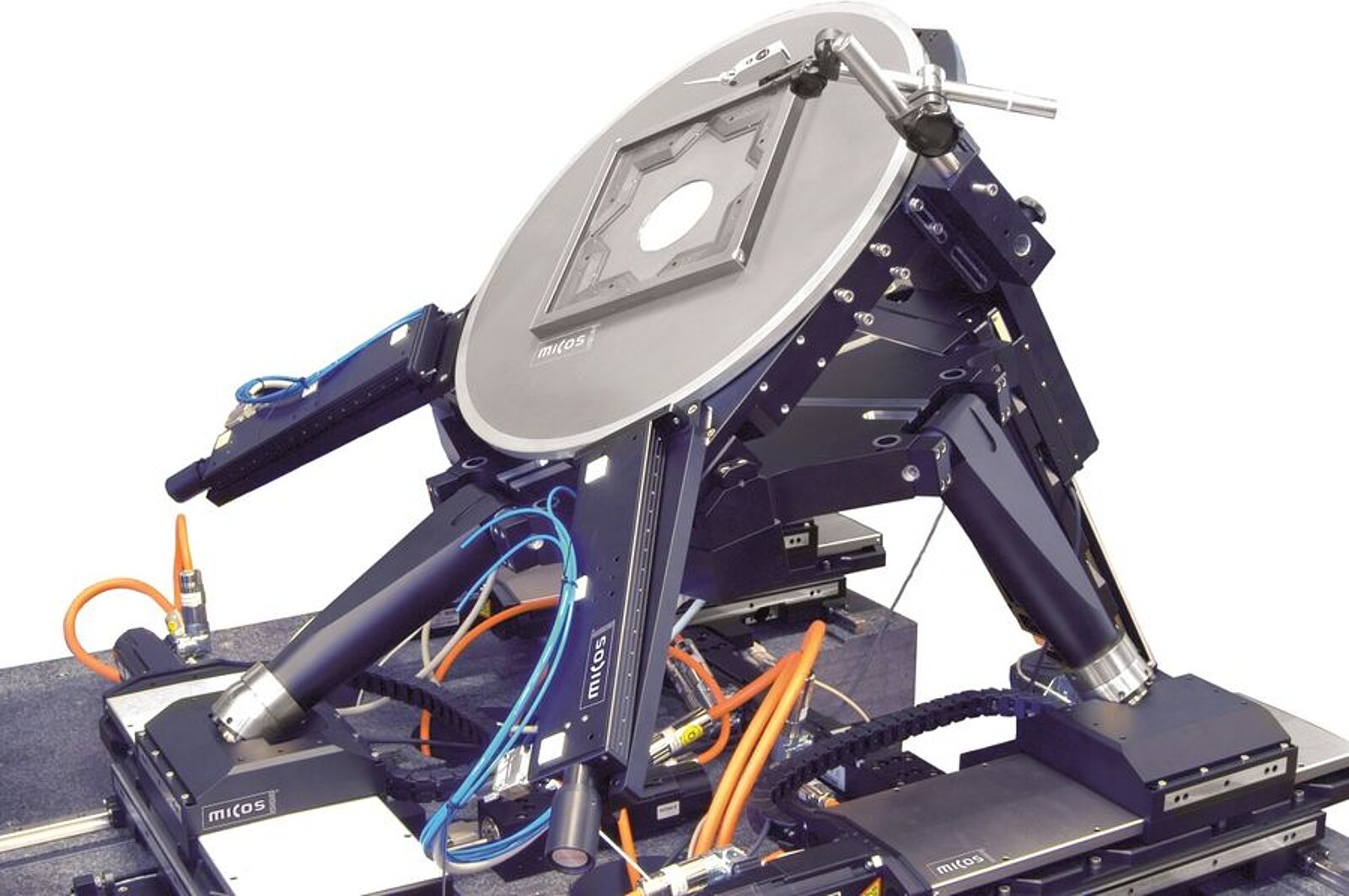 The angle at which the sample is rotated with respect to the synchrotron X-ray beam needs to be adjustable, while the lateral position of the sample itself allows the choice of the region of interest, securely and repeatably. The solution is a six-axis parallel-kinematic SpaceFAB underneath rotation and tilting stages on which the actual sample carrier is placed. Essential SpaceFAB features are the freely selectable pivot point and its high stiffness. The linear travel ranges are 150 mm × 150 mm × 50 mm, at 0.2 μm position resolution, ±12.5° tilting is possible for the axial angle, and ±5° for the other directions. Precision is provided by optical linear encoders and the high-precision mechanical components which are driven by a combination of stepper motors and ball screws.