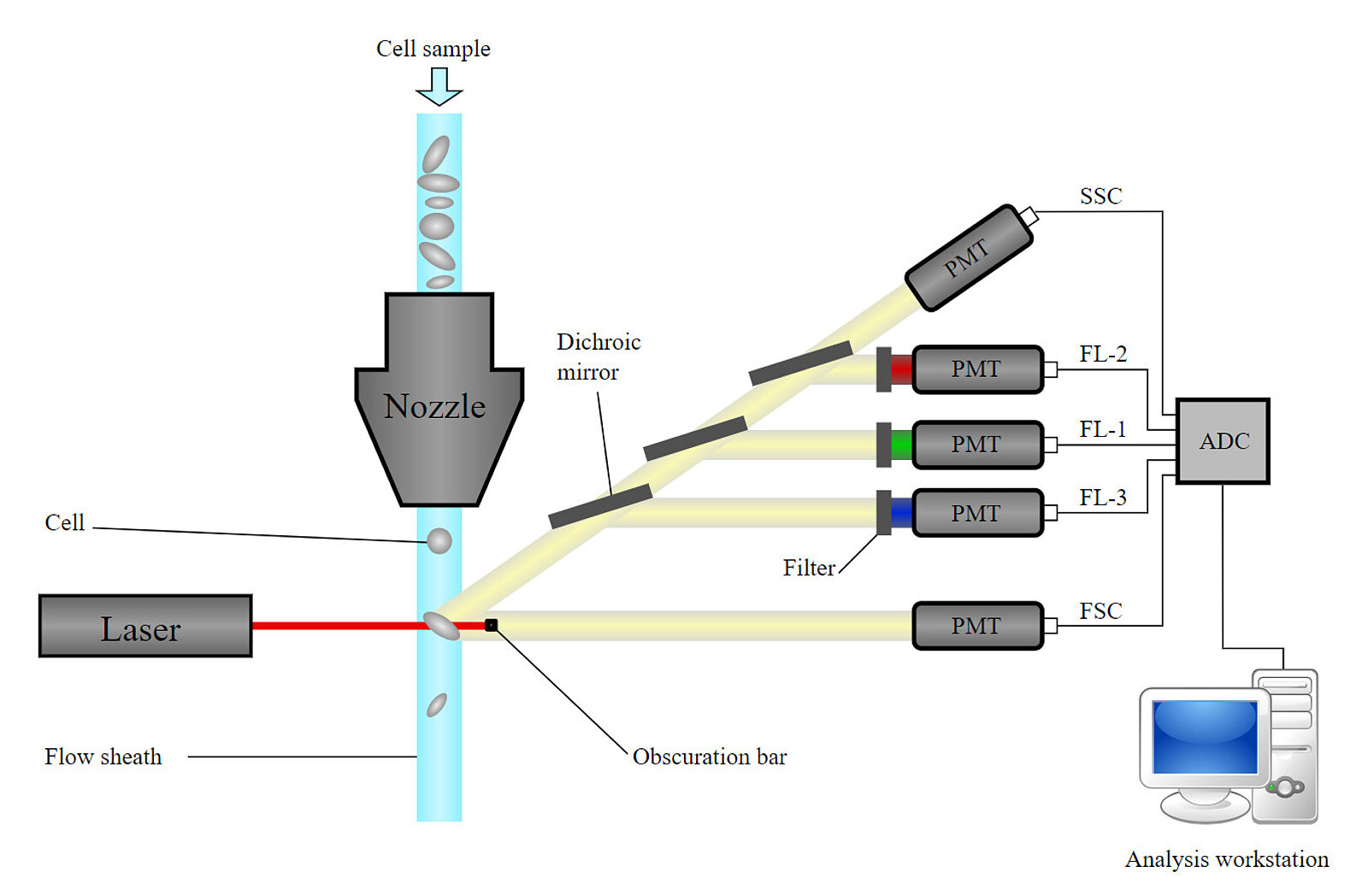 基本原理は、特殊な解析を行うためにさまざまな方法で変更することができます。下の画像をご覧ください、例えば、蛍光活性化セルソーティング (FACS) は、あらかじめ色付けされた細胞をその異なる特性によって区別し、選別するための非常に効率的な方法です。
