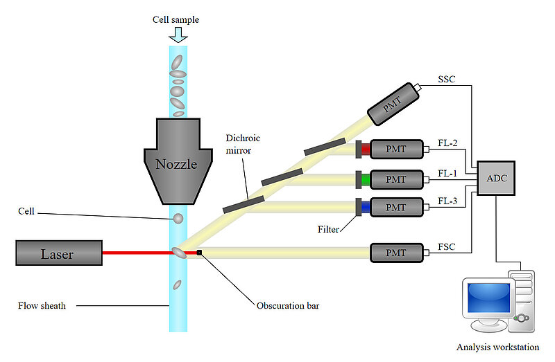 フローサイトメトリーは、ハイスループットな測定および解析手法であり、血液学、感染学、免疫学など臨床の日常的な診断においてますます重要性が増しています。応用分野の大部分は、バイオテクノロジーだけではなく、医学や細胞生物学の基礎研究です; ここでは、細胞の定量解析が最も重要な用途の1つです。