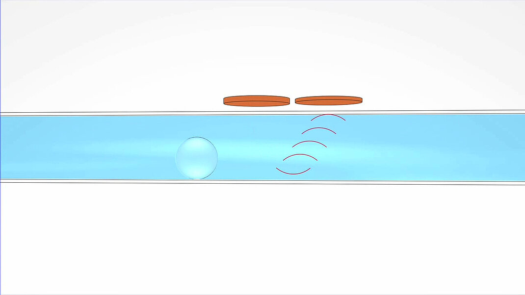 気泡の検出が可能になったことで、患者の安全性が格段に向上しました。輸液システムは、モニタリングのために複数の気泡検出器を統合することができます。これらは、誘導された音波の伝搬時間を測定するものです。チューブの中の気泡に音波が当たると、2つの媒体の間にはインピーダンス差があるため、気泡の界面で反射されます。気泡のないチューブの伝搬時間を測定して比較すると、音波の伝搬時間が短くなっているため、すぐに気泡を検知することができます。 例えば、人工心肺装置のチューブ内に気泡が検出された場合、直ちにポンプの動作を停止します。汚染された血液はリザーバに転送され、体外式血流は中断することなく再び機能するようになります。