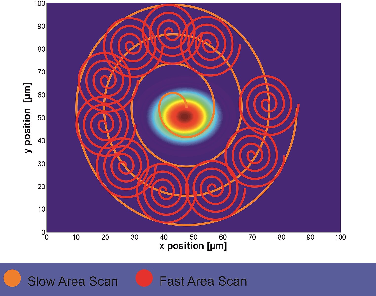 FMPAのエリアスキャンには、単一周波数の正弦波スキャンとスパイラルスキャンがあります。これらは真に連続的でありそして伝統的な走査で使用される停止および開始運動の整定要件を回避するので、それらは伝統的なラスターまたは蛇行性走査よりもはるかに速く、そして共振構造を回避するために周波数を選択できます。等速スパイラルスキャンもまた選択され、スパイラルにわたって一定の密度でデータを取得することを可能にします。