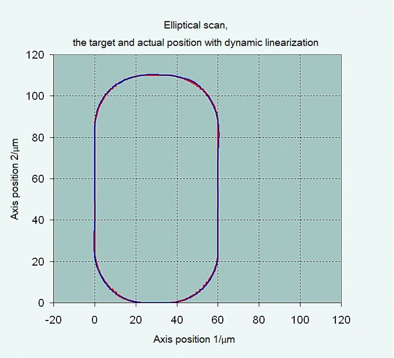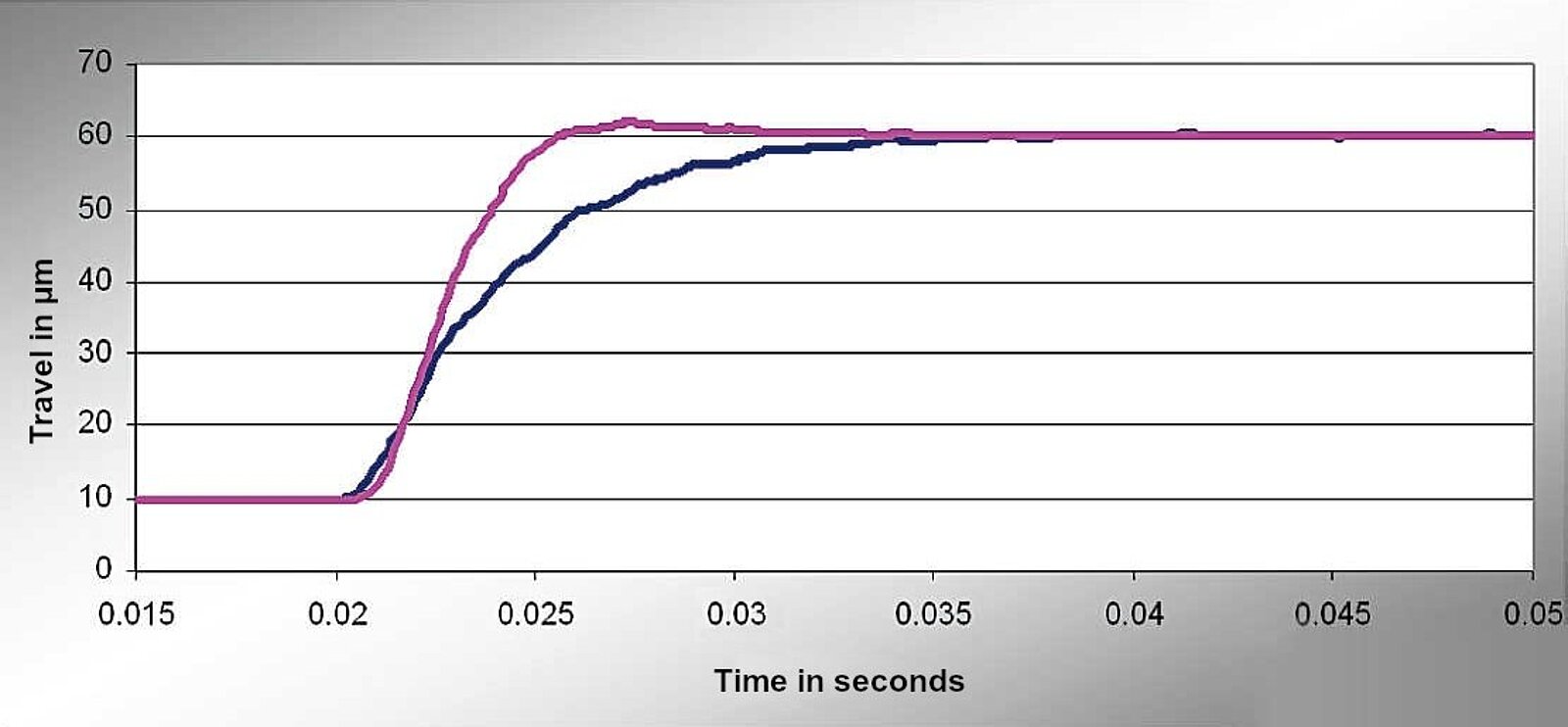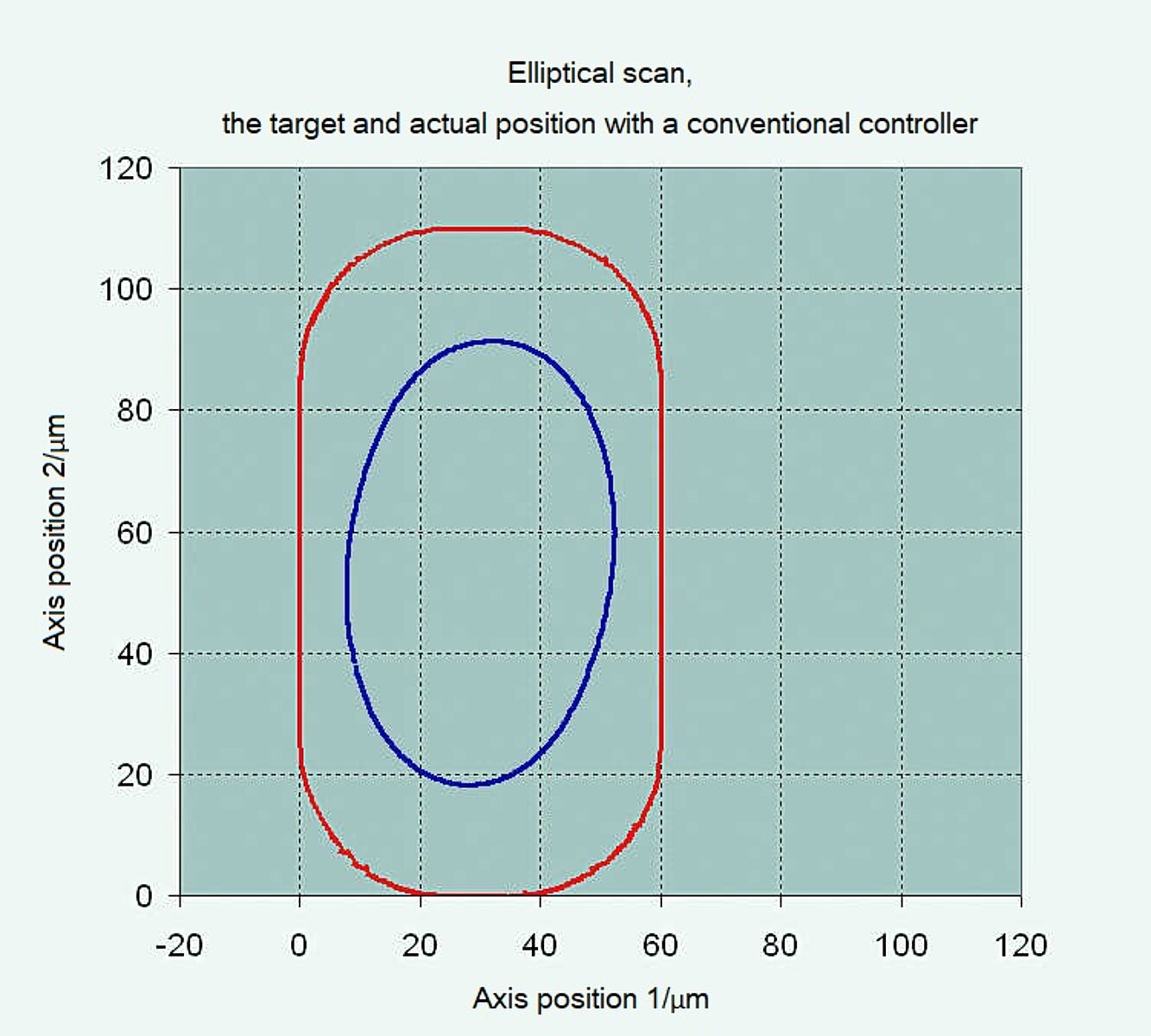 ナノポジショニングシステムには、アドバンスドピエゾコントロールという別の制御の概念があります。この概念のベースは、位置決めシステムのモデルに基づく状態空間コントローラーです。ノッチフィルターを搭載し、励起スペクトルから機械的共振を削除する従来の比例積分微分(PID)コントローラーとは対照的に、アドバンスドピエゾコントロールでは共振周波数を減衰させます。このため整定時間が短縮され、外部からの干渉の影響を受けにくくなっています。1つもしくは2つのノッチフィルターで減衰を行う場合に比べ、位相忠実度は大きく向上しています。これは、経路忠実性と整定挙動に直接的な効果をもたらしています。