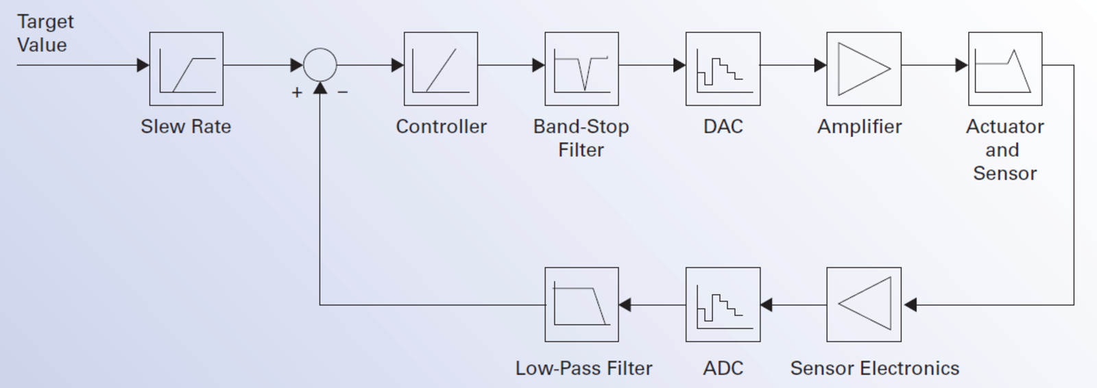サーボループの役目は、実位置と目標位置とのずれを補正することです。この補正は、ノッチフィルターを搭載した比例積分コントローラーで行うのが一般的です。ただし、用途によっては、線形化アルゴリズムを組み合わせた別の手法の方が良い結果を得られる場合があります。デジタルフィルターでは、不要な機械的励起を防止してノイズを抑えることで、システムの分解能を高めることができます。