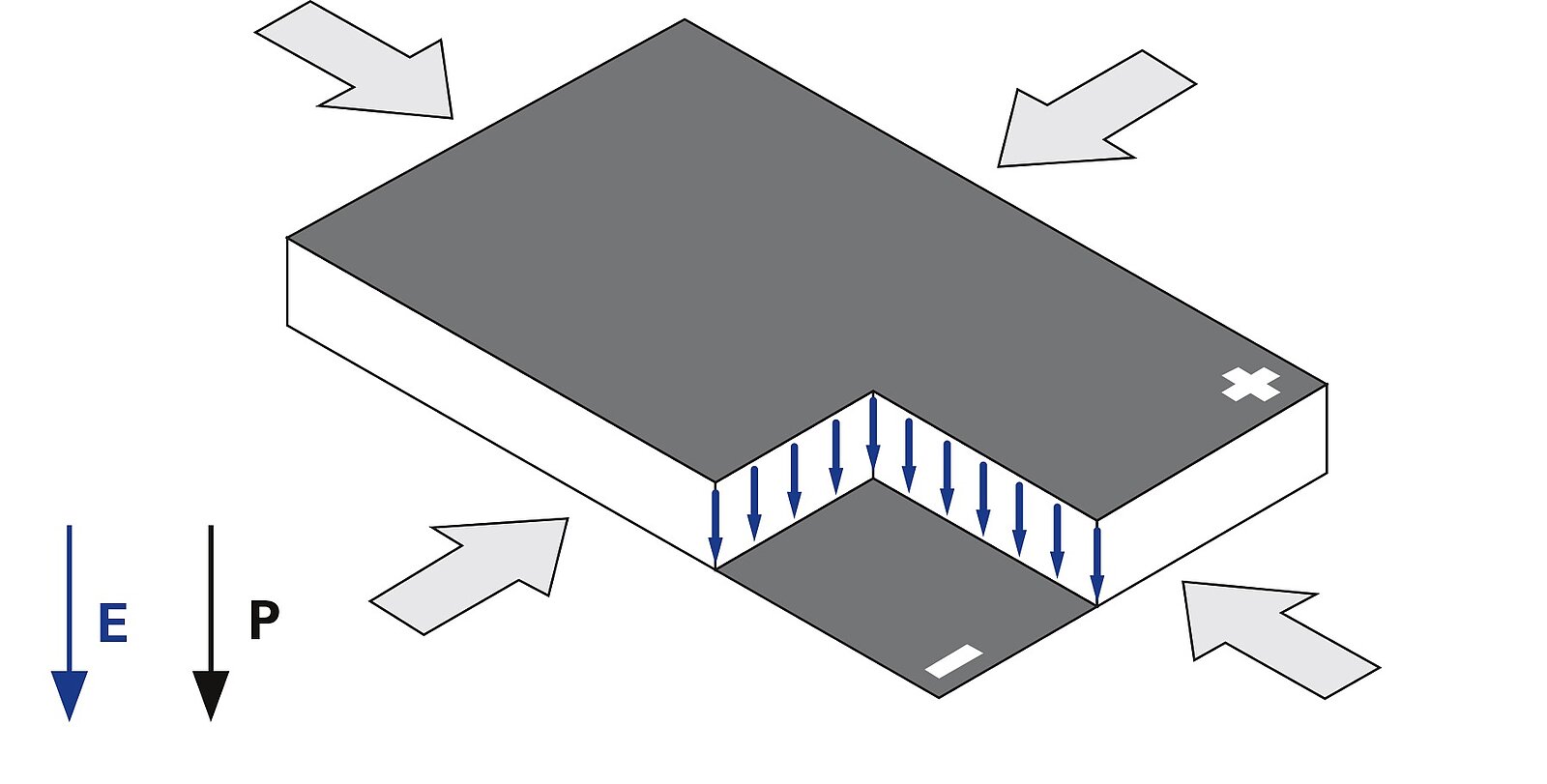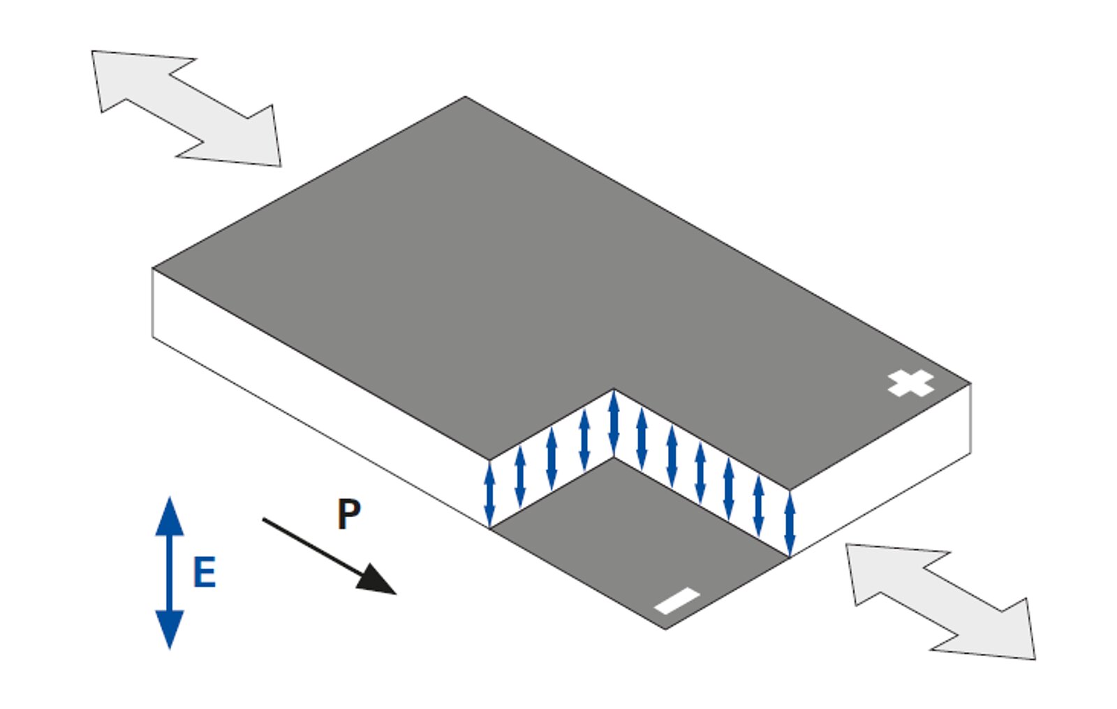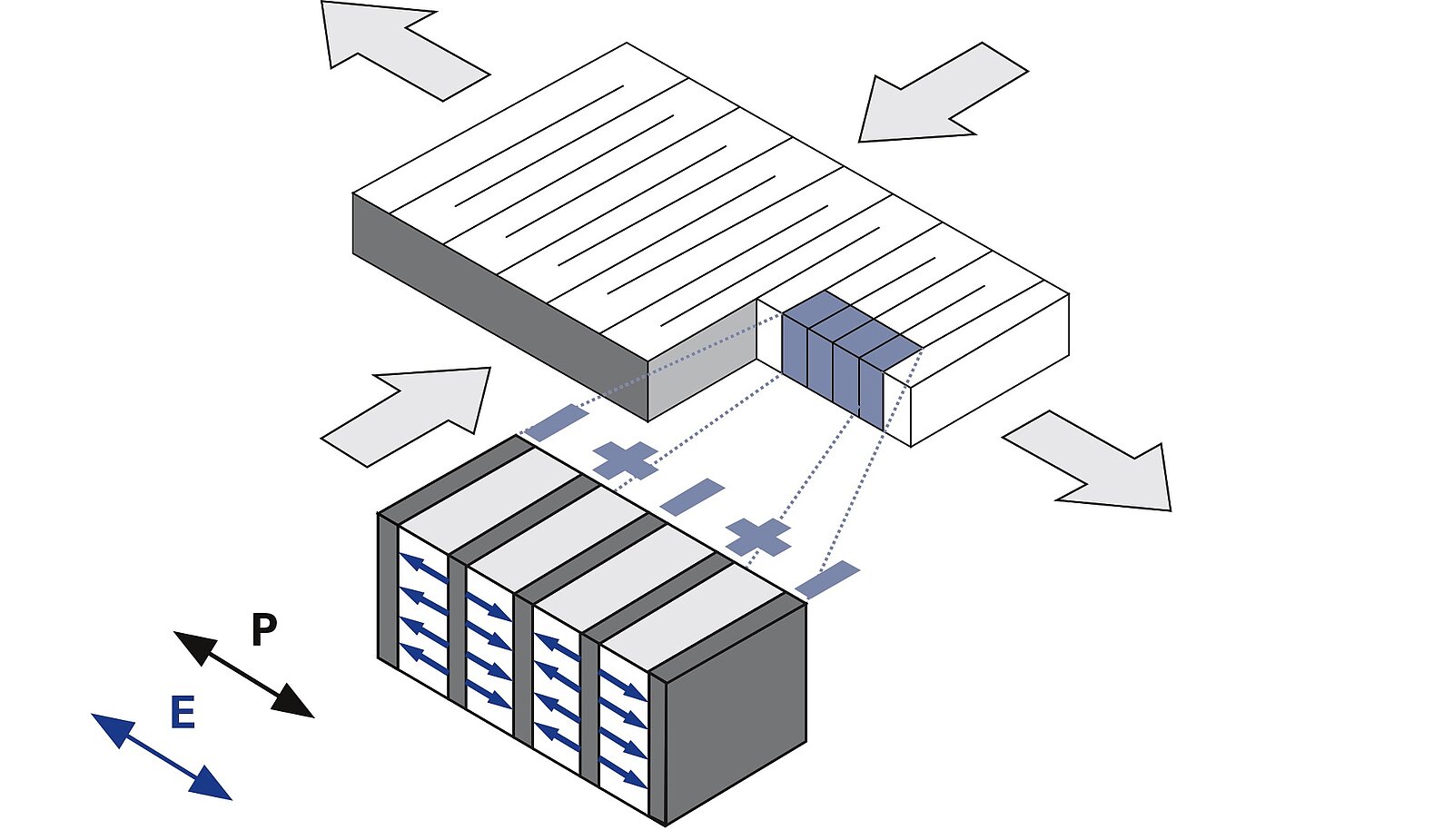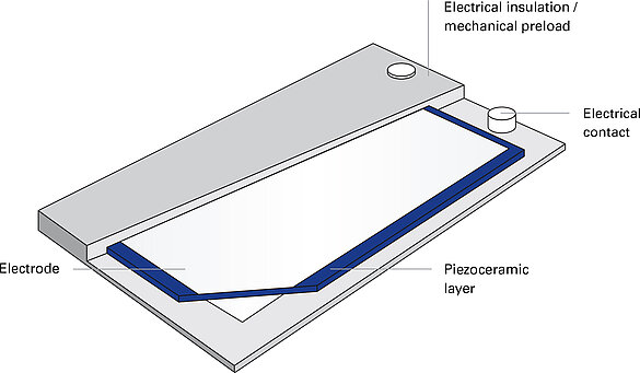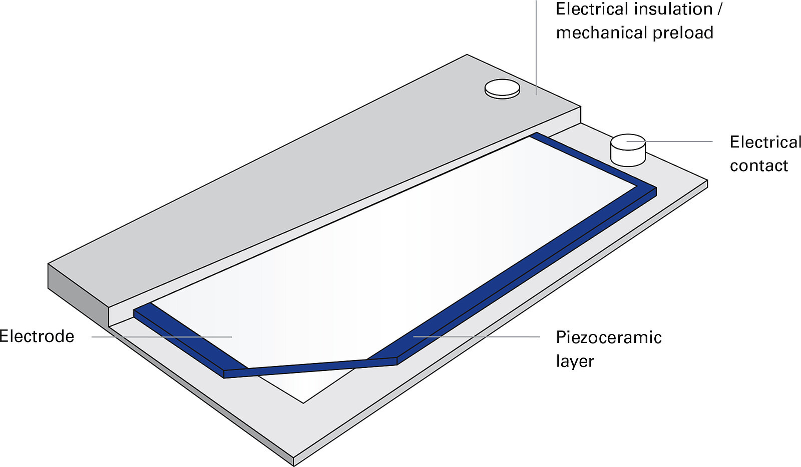 DuraActパッチトランスデューサの電界強度がセラミックの変位を決定するため、モジュールを簡単に制御することができます。この変形は、単純な結合を介して構造要素に効果的に伝達されます。従来のアクチュエータのように離散的な点ではなく、推力によってアクチュエータの表面全体に力が伝達されます。このため、大量の力伝達点は不要です。逆の言い方をすると、構造の変形がトランスデューサーにより電荷に変換されるため、素子をセンサーや発電機として利用可能です。センサーとアクチュエーターの機能を分割して、いくつかの層のアイソレーションコンタクトで実現しています。