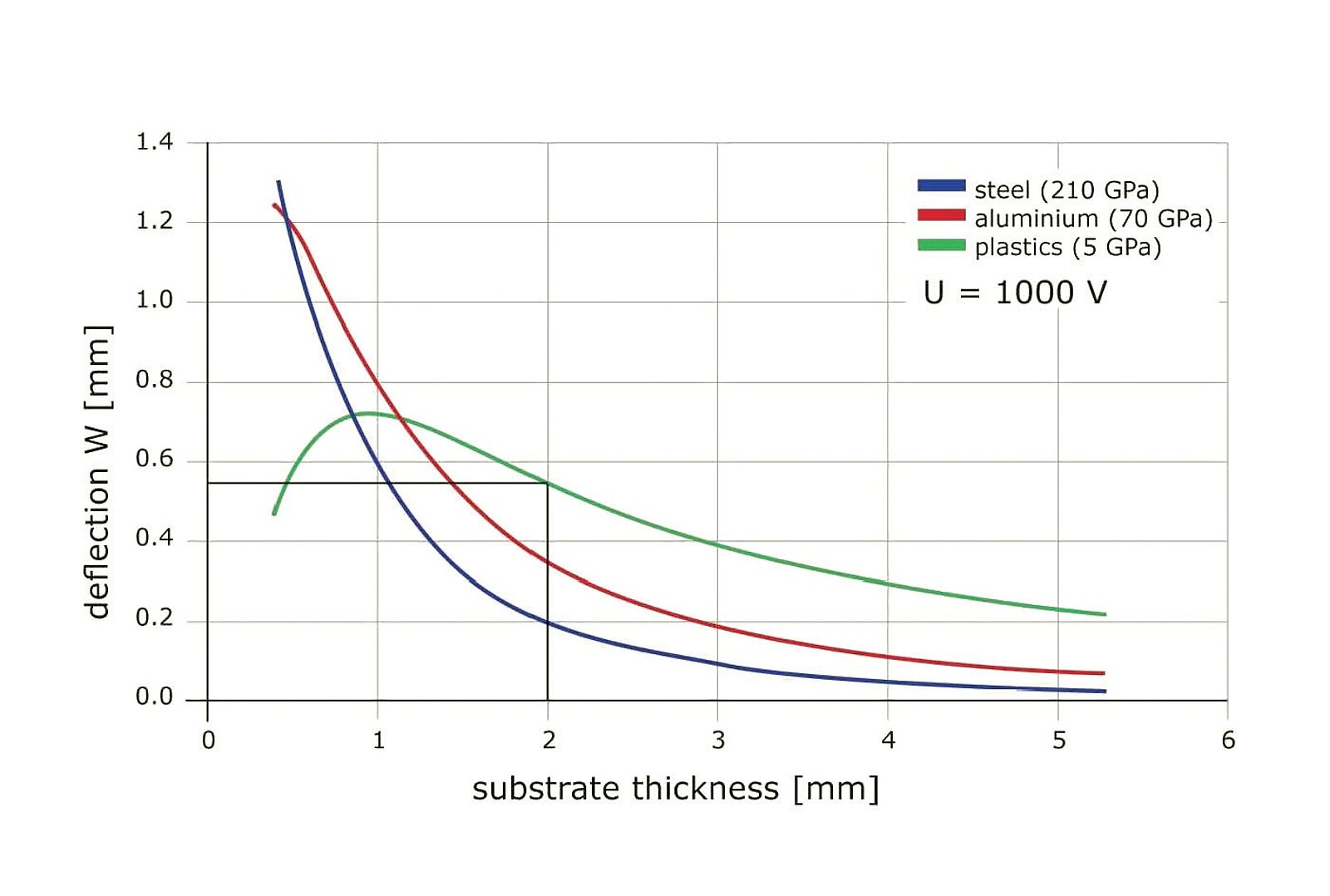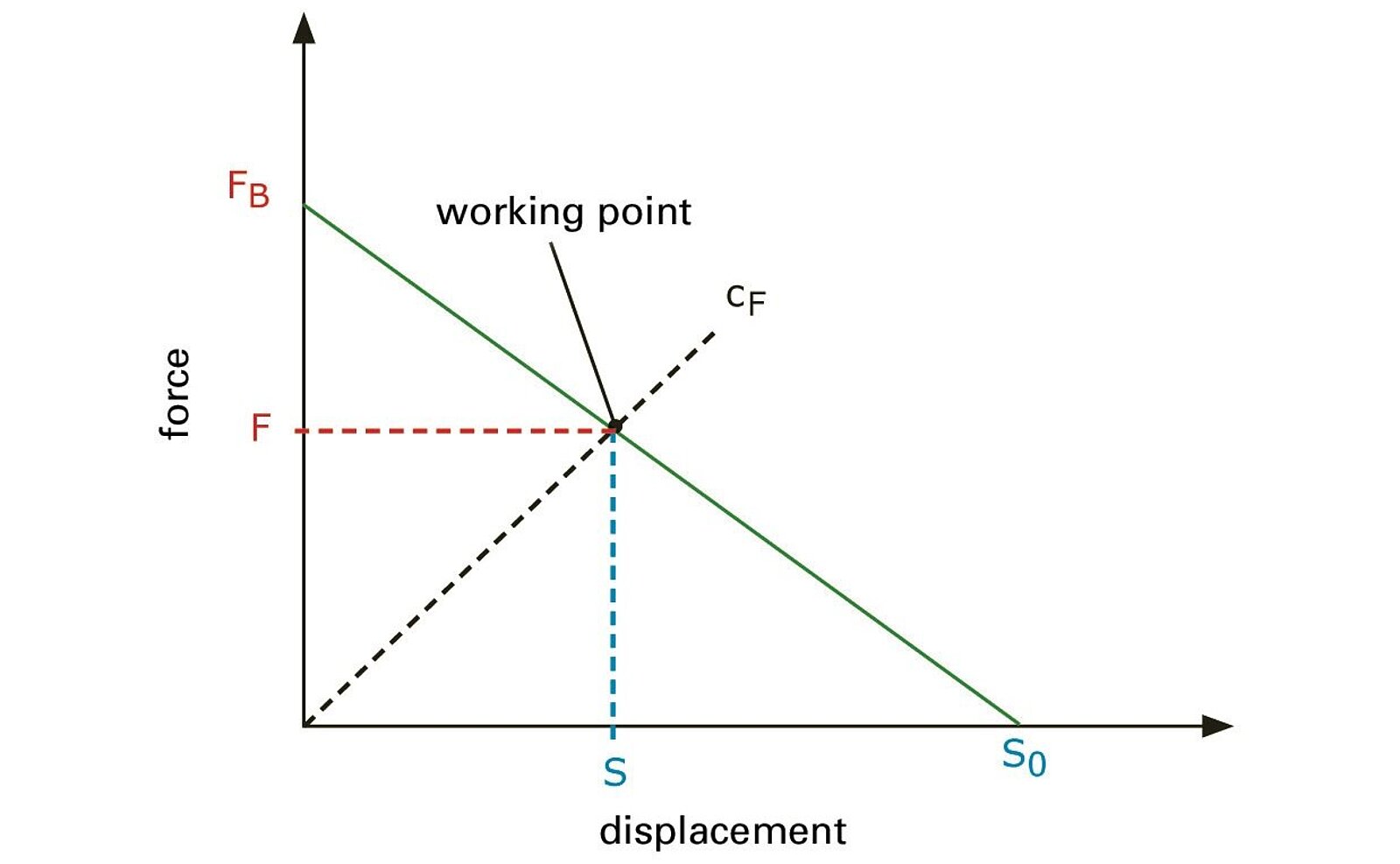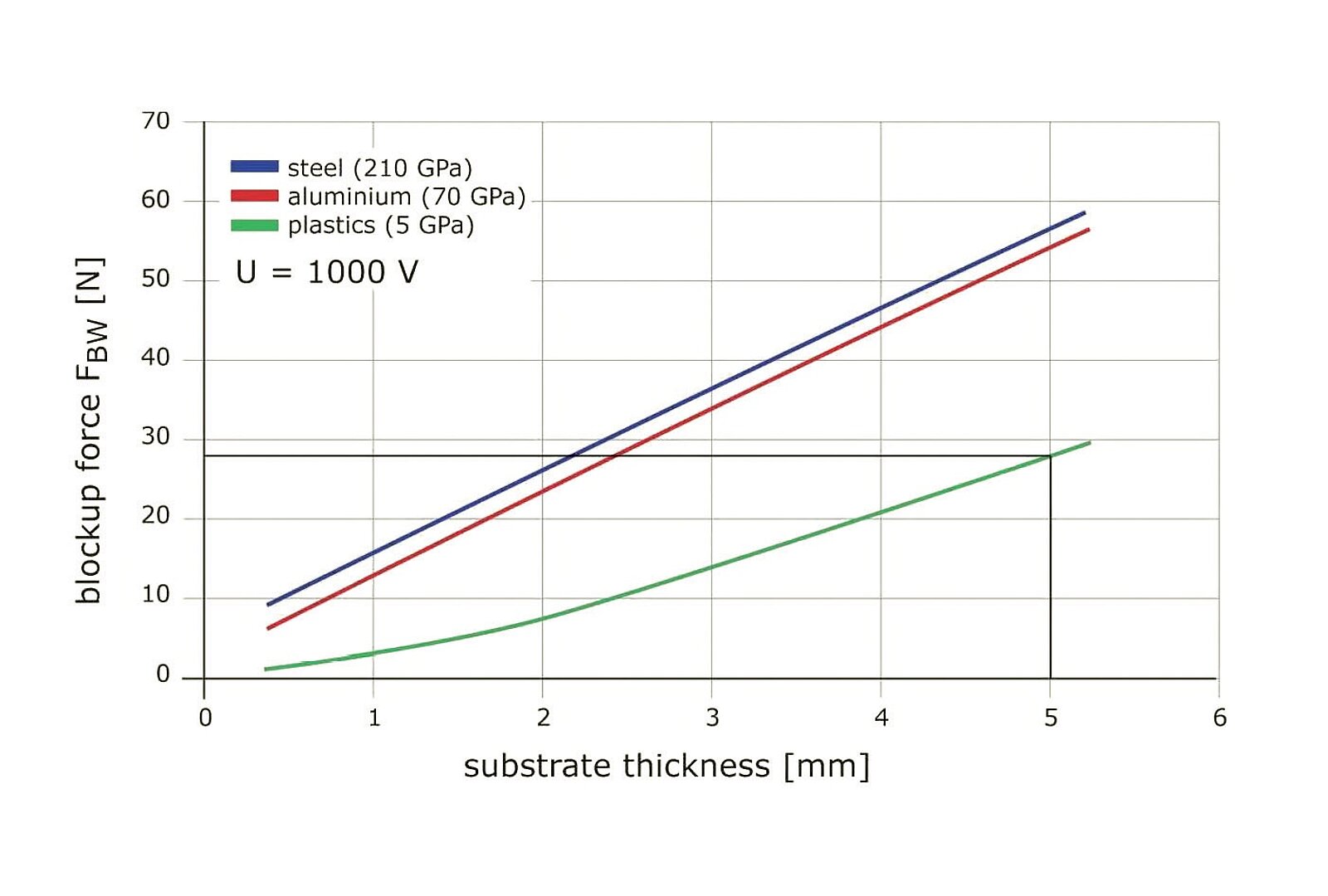 DuraActアクチュエータは一般に基板に接着されており、収縮を数箇所の取付点だけでなく、面全体に伝達します。こうした構成では、DuraActと基板の組み合わせはベンディングアクチュエータとして動作します。ベンディングアクチュエータは再現性をもって迅速、高精度に変位を起こすことができ、プリンター、バルブ、繊維業界など幅広い用途に使用されています。 DuraActパッチトランスデューサーは横方向ピエゾ効果に基づいているため、電界を印加すると収縮します。このベンディングアクチュエータは図に示すように屈曲し、垂直抗力を発揮します。 自由で制止されていない曲がり素子の自由変位はW0で表します。変位を0に抑えるのに必要な力は、曲がり素子の発生力FBWと呼ばれます。この力は、アクチュエータの発生力より非常に小さくなります。これらの2点を通る曲線から、基板の厚さと弾性に対する曲がり素子の特性曲線が得られます。 図に、さまざまな素材の50 mm厚の基板サンプルとP-876 A15 DuraActパッチトランスデューサーを使用して測定した実際の変位と力を示します。 曲がり素子の特性曲線は、DuraAct単体の特性曲線と組み合わせることで、効率良く特定の用途におけるアクチュエータの性能を推定できる基準となります。このため、弊社では、すべてのデータシートにこれらの曲線を記載しています。