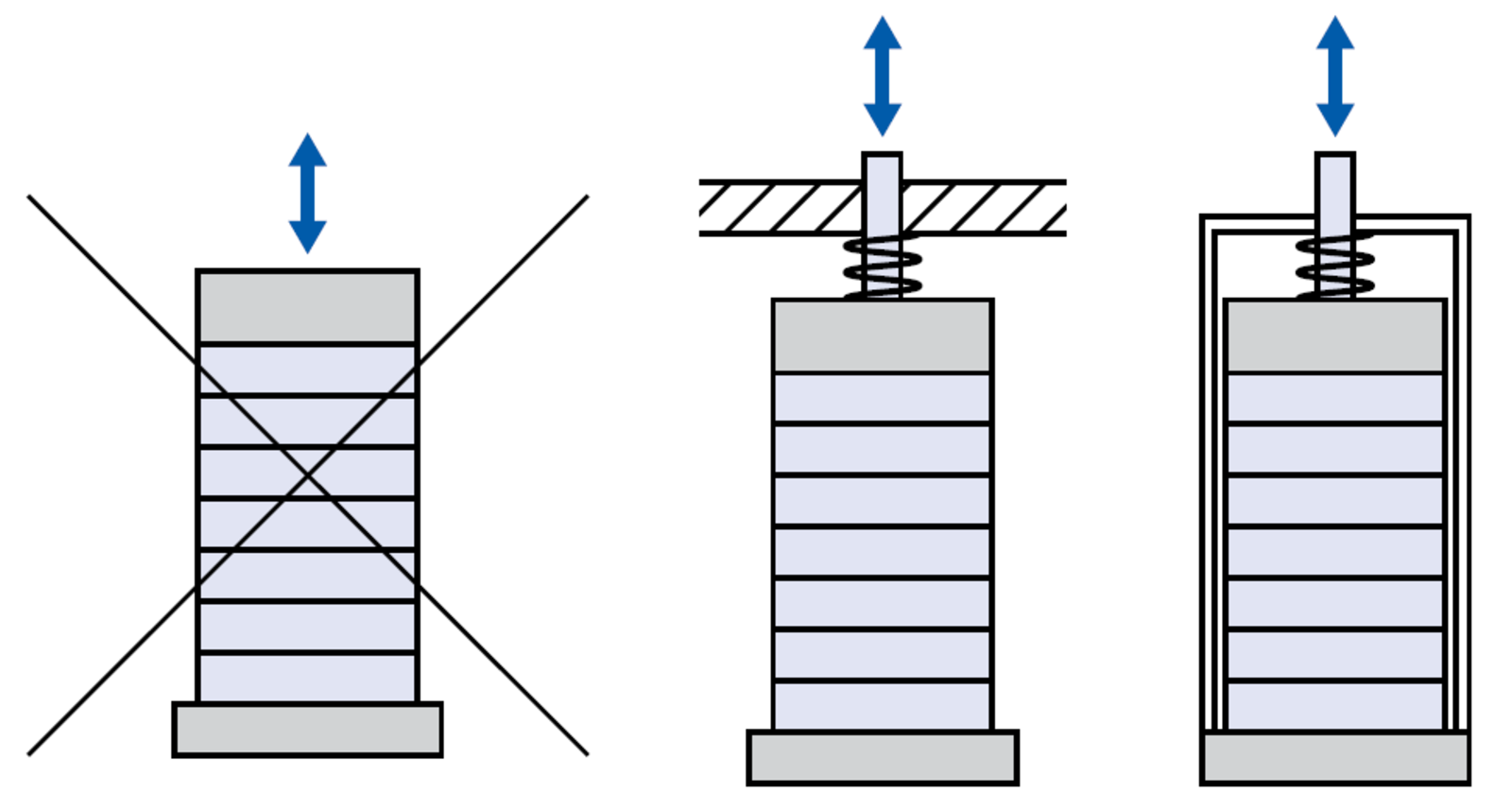 壊れやすい圧電アクチュエータおよび単結晶アクチュエータの引張強度は、5~10 MPaと比較的小さい値となります。このため、装置ではアクチュエータに対し力学的なプリロードをかけることが推奨されます。プリロードはできる限り小さいものを選ぶ必要があります。経験によれば>>動的外力の補償には15 MPaで十分であり、荷重が一定の場合30 MPaを超えないようにする必要があります。