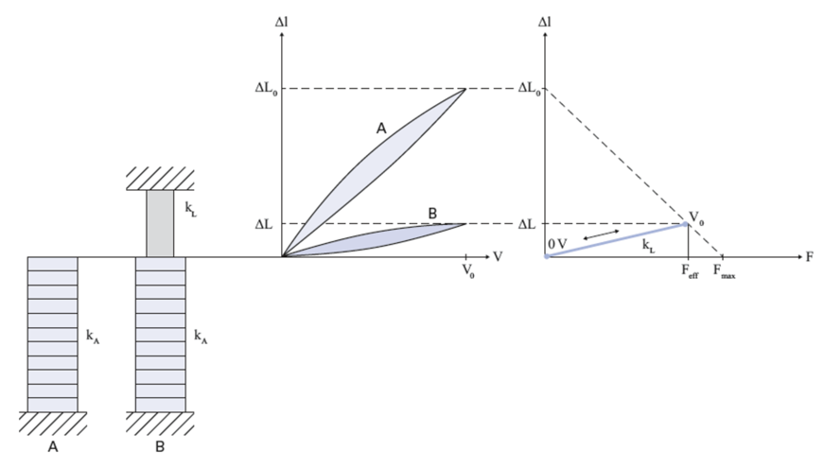 アクチュエータの動作時に電気エネルギーから力学的エネルギーへと変換されるエネルギー量E mechは、図9の曲線下の面積に相当します。ただし、力学的負荷に伝達できるのはこの総量の一部分のEout のみです。力学系は、曲線下の面積が最大となる場合にエネルギー的に最適となります。これは、負荷の剛性とアクチュエータの剛性が等しい場合に生じます。動作グラフでは、薄い青色部分の面積がこのエネルギー量に相当します。縦方向ピエゾアクチュエータでは2~5 mJ/cm³程度の力学的仕事を行うことができ、ベンディングアクチュエータで達成できる仕事量はこの10分の1程度となります。