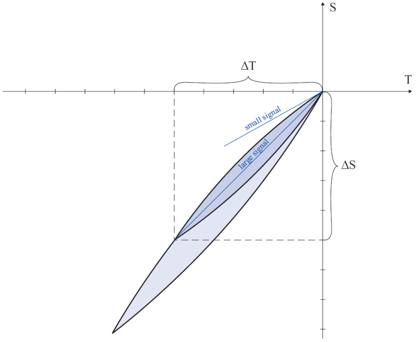 ピエゾアクチュエータを指定する場合、準静的な大信号剛性は電界強度または電圧が大きく力学的プリロードが小さい同時制御で決まります。この剛性は好ましくない動作事例を考慮に入れる際に役立ちます。すなわち、多くの用途では実際のアクチュエータの剛性は大きいものになります。