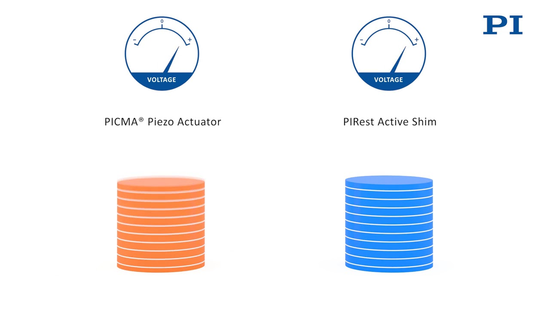 一方、PICMAなどの通常のピエゾアクチュエータと同程度の稼働距離で、静的に使うが電源を切ってもその場を維持したい用途の場合には、PIRestアクティブシムが有用です。恒温下での長期位置安定性に優れており、構造的にPI社のピエゾアクチュエータPICMAと同じであることから、真空や非磁性環境での動作が可能であり、お客様のサイズ制限や仕様に合わせて素子を成形することが可能です。また、通常のピエゾアクチュエータと同様に多軸ステージまたはヘキサポッドに応用が可能です。