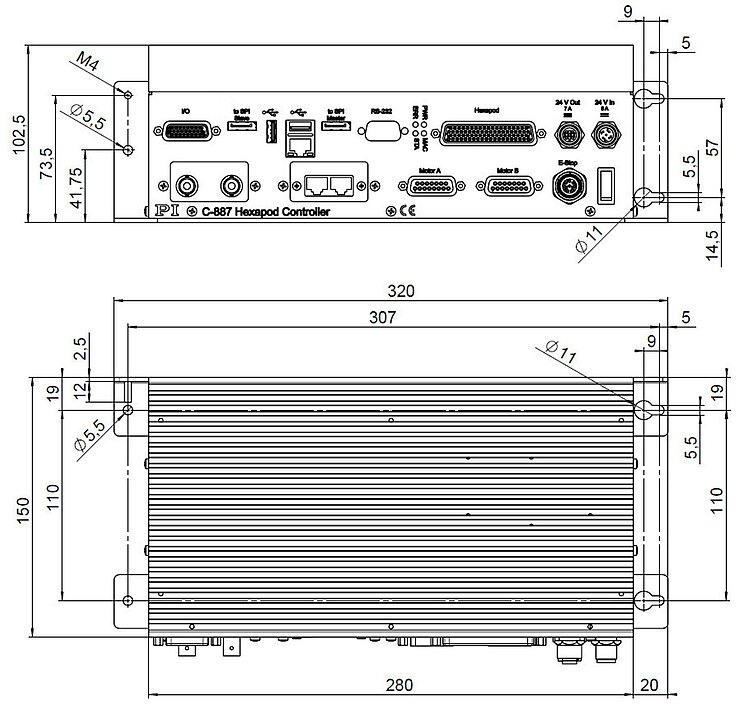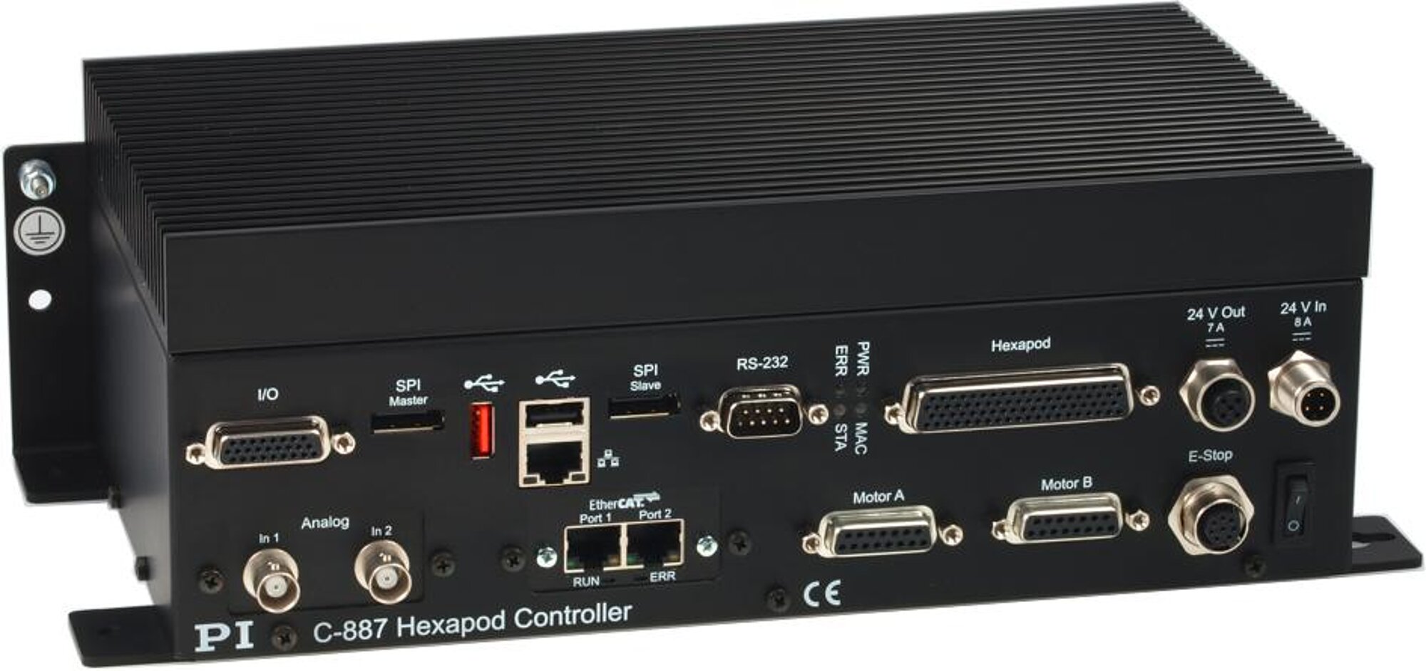 Digital controller for hexapods (6-axis parallel kinematics). In addition, the motor drivers for two further single axes can be controlled. For operation in an EtherCAT network, a higher-level programmable logic controller (PLC) is required on the user side (EtherCAT master with CoE protocol). Operation without PLC is possible via TCP/IP or RS-232. The controller then corresponds to a C-887.52x in terms of functionality and is controlled with the GCS 2.0 command set.