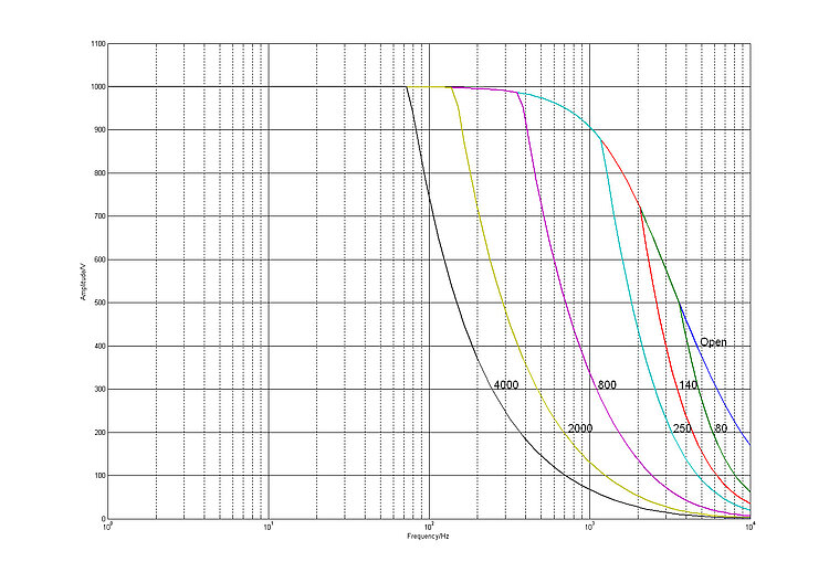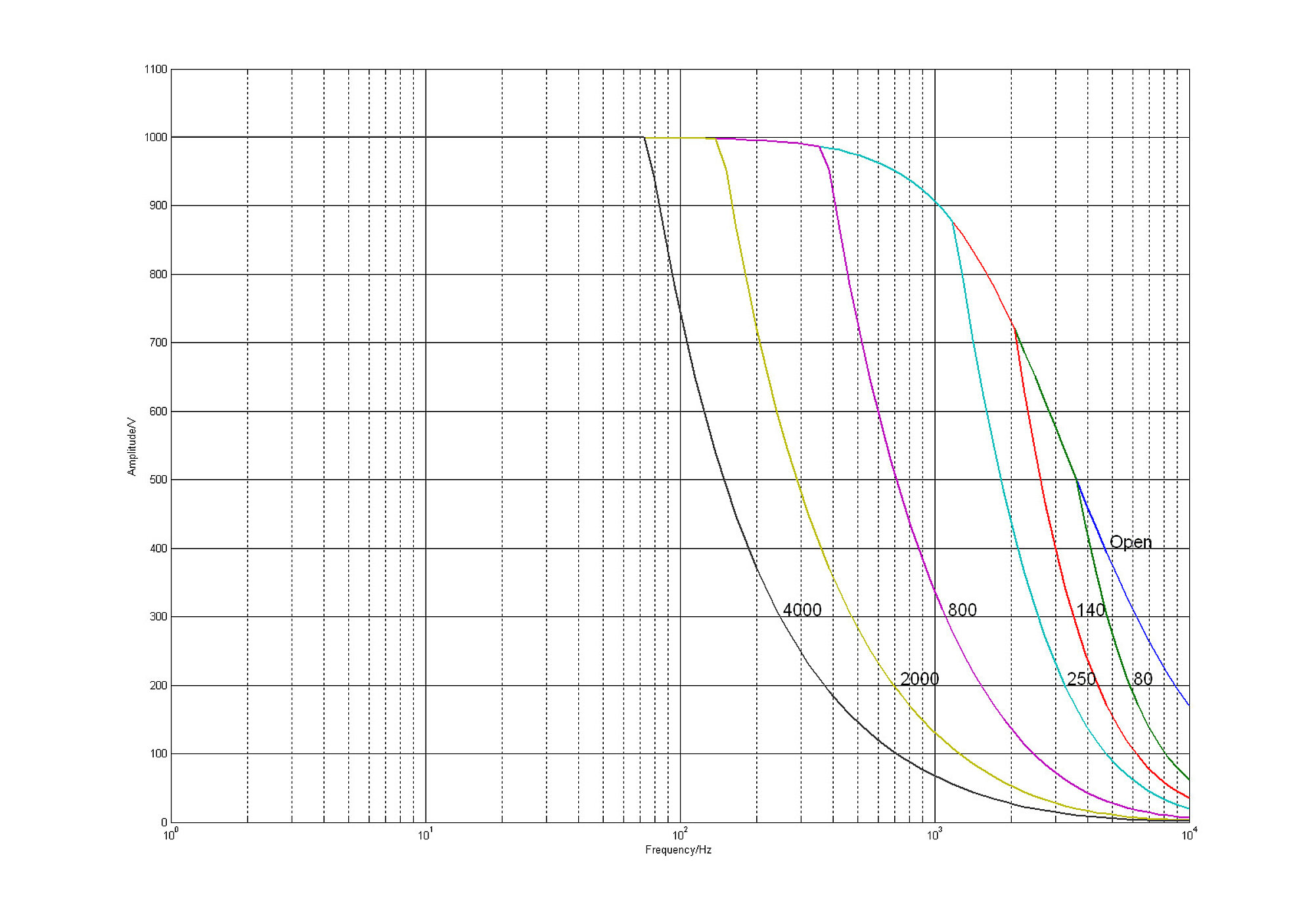 Amplifier bandwidth, large signal | 1.4 kHz (660 nF), 350 Hz (3.4 µF) |