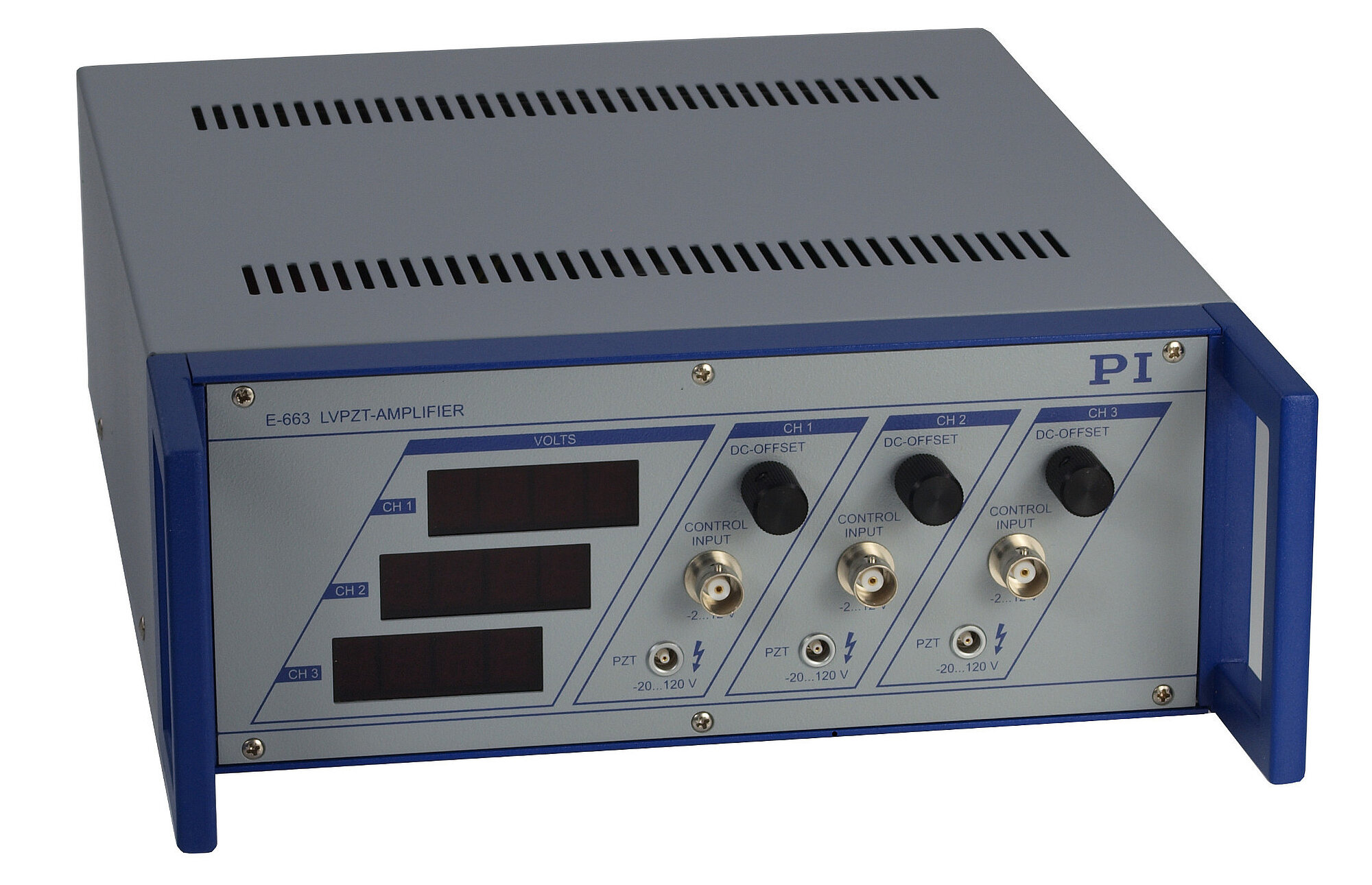 The E-663.00 benchtop amplifier has three low-noise amplifier channels for low-volt piezo actuators that input and output peak currents of 140 mA in a voltage range of -20 to +120 V. Three 3½-digit LED displays are available for showing the output voltages.