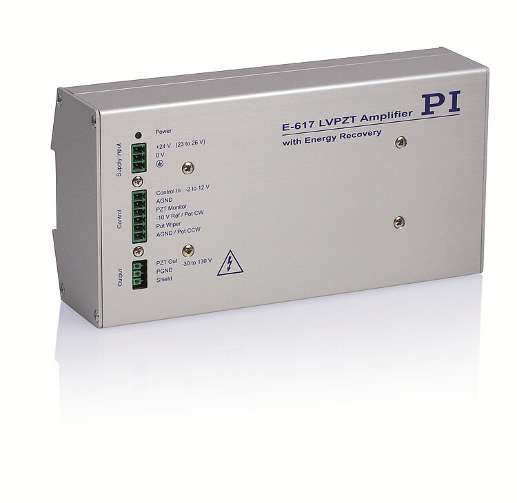 The efficient switching principle reduces the power consumption and heat dissipation considerably, especially in dynamic applications. In this way, the energy is coupled into the piezo with low loss via pulse width modulation (PWM). The energy generated by the discharging piezo is recovered and made available for the next charge. A unipolar supply voltage between 23 to 26 V DC is sufficient for operation.
