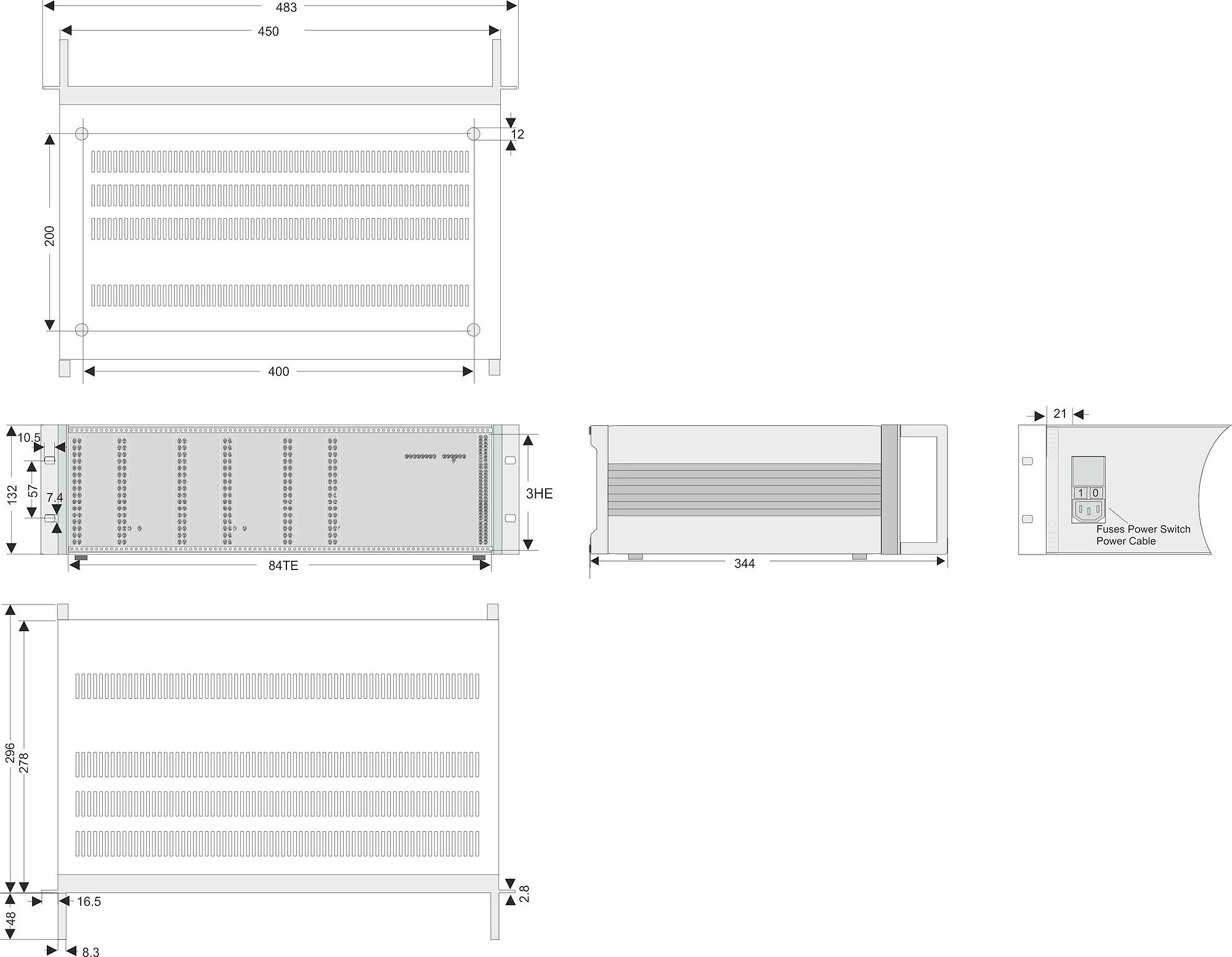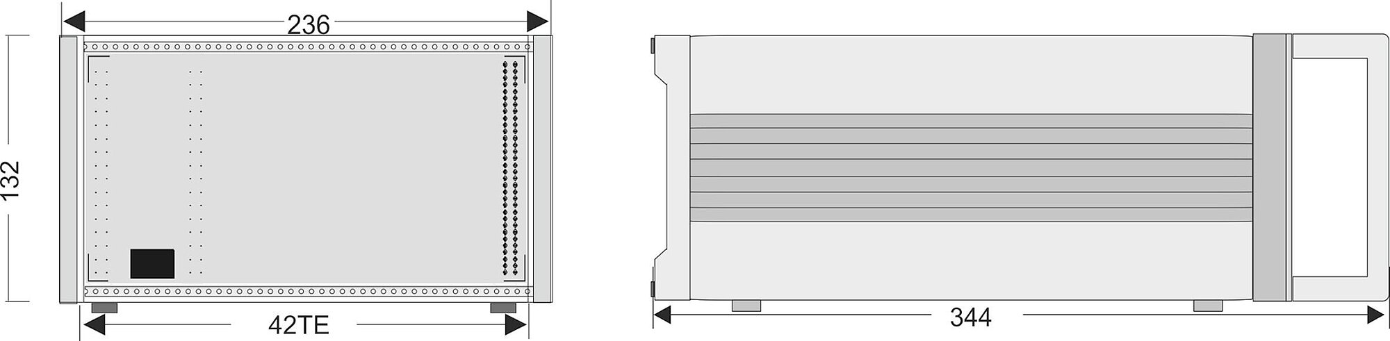 Dimensions | 21 HP/3 U | 236 × 132 × 296 mm (without handles) / |