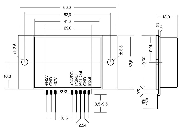 Compact OEM module in shielded metal housing; easy integration with soldering pins for mounting on boards; ideally suited for assembling multi-channel solutions. Benchtop device for laboratory applications and fast startup. 24 V operating voltage, piezo voltage and other supply voltages are generated internally.