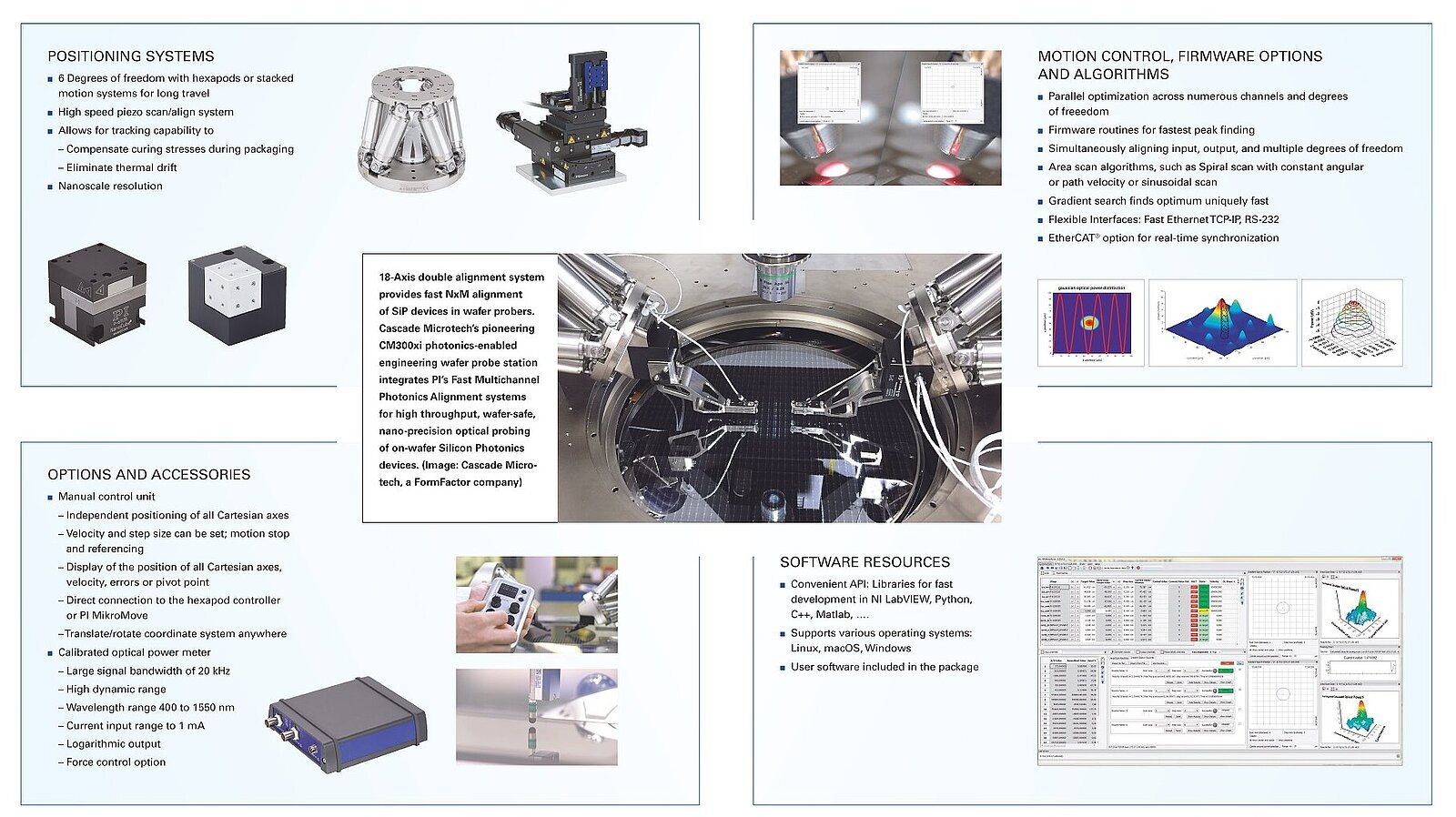 PIのFast Multi-Channel Photonics Alignment(FMPA)システムは、高度に特殊化されたデジタルモーションコントローラー(E-713)とハイブリッドアクティブアライメントメカニズムに基づいており、安定性、解像度、アライメント速度を犠牲にすることなく、必要な長い移動範囲を実現します。FMPAはE-713コントローラーのモジュラーファームウェアに実装されており、複数の自由度でマルチチャネルカップリングの高速かつ同時のアライメントとトラッキングを可能にします。最初の光検出、エリアスキャン、および勾配検索のための効率的なアルゴリズムにより、24時間365日の運用で最高のスループットが保証されます。