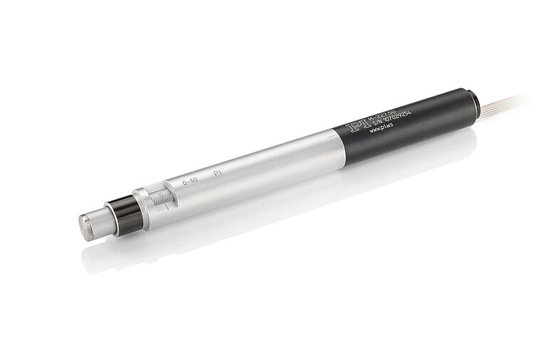 High-resolution linear actuator with DC motor; DC gear motor; 50 mm travel range; 40 N feed force; 0.75 mm/s maximum velocity; trapezoidal-threaded spindle; incremental rotary encoder, 2048 counts/rev. sensor resolution; 0.1 m cable length