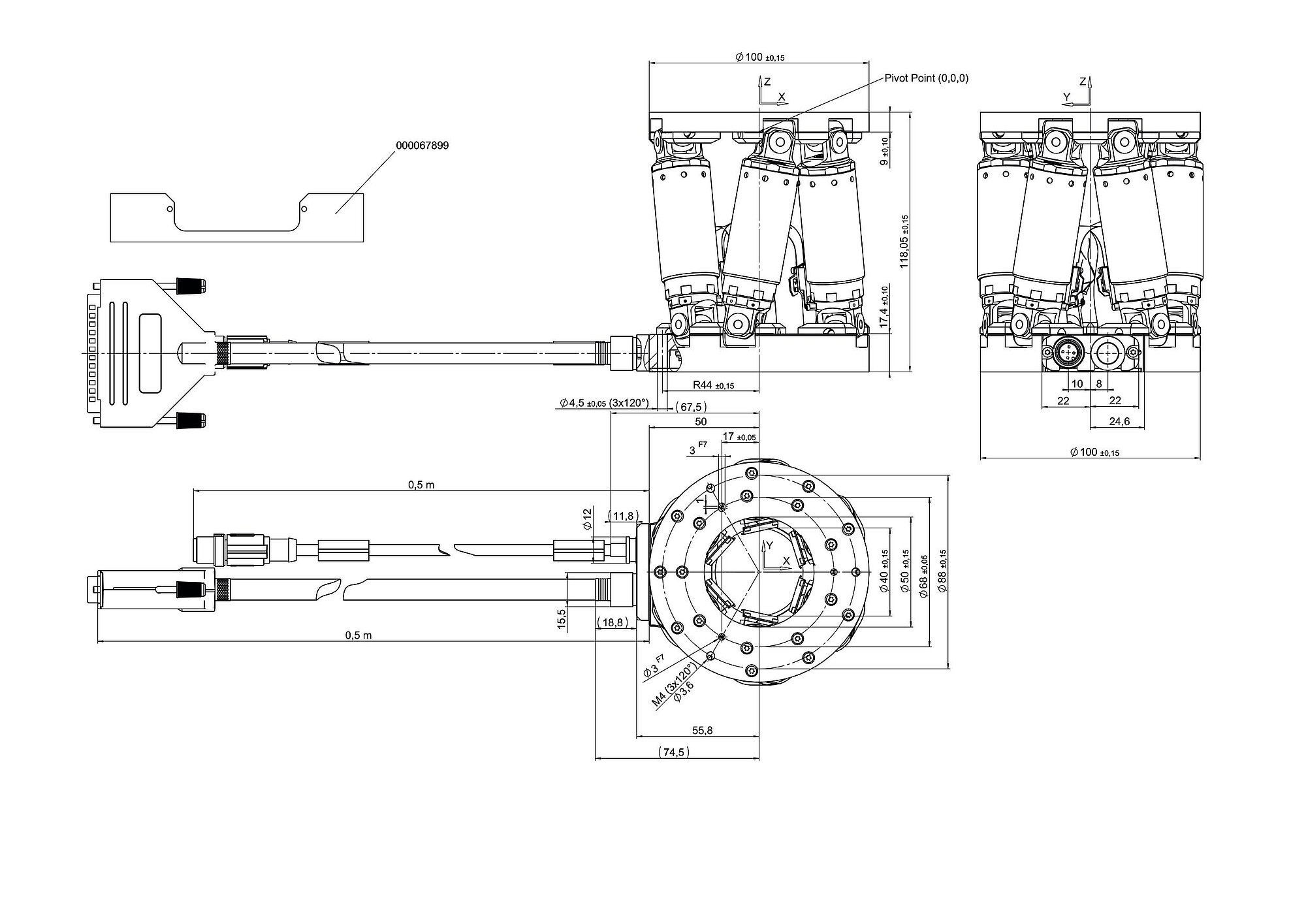 6自由度の小型ヘキサポッド、ブラシレスDCモーター搭載、耐荷重:3 kg、速度:6 mm/s、ケーブル長:0.5 m。 接続ケーブルは同梱されていませんので、別途ご注文ください。