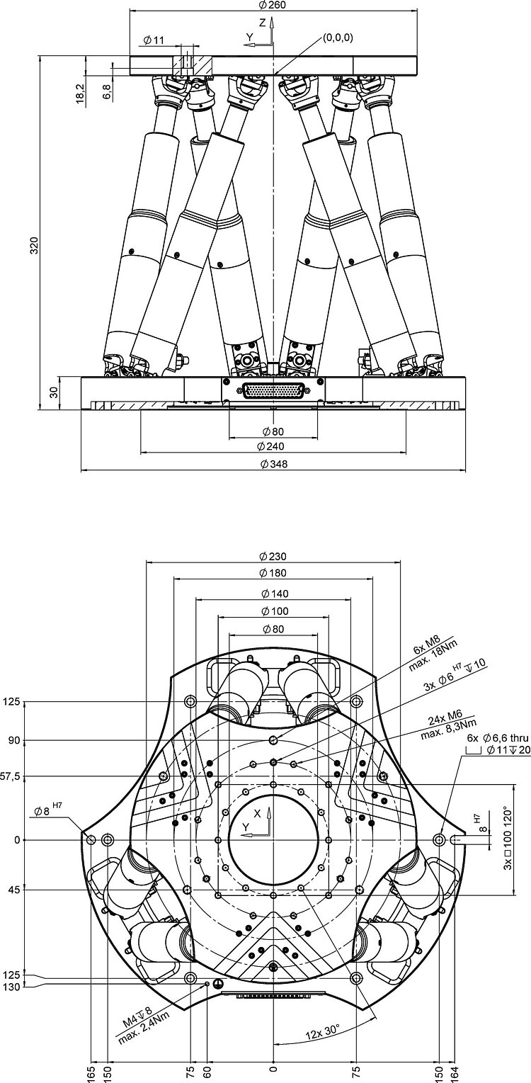 モーションヘキサポッド、ブラシレスDCモーター、アブソリュートエンコーダ、耐荷重:10 kg、最大速度:60 mm/s。 接続ケーブルは同梱されていませんので、別途ご注文ください。