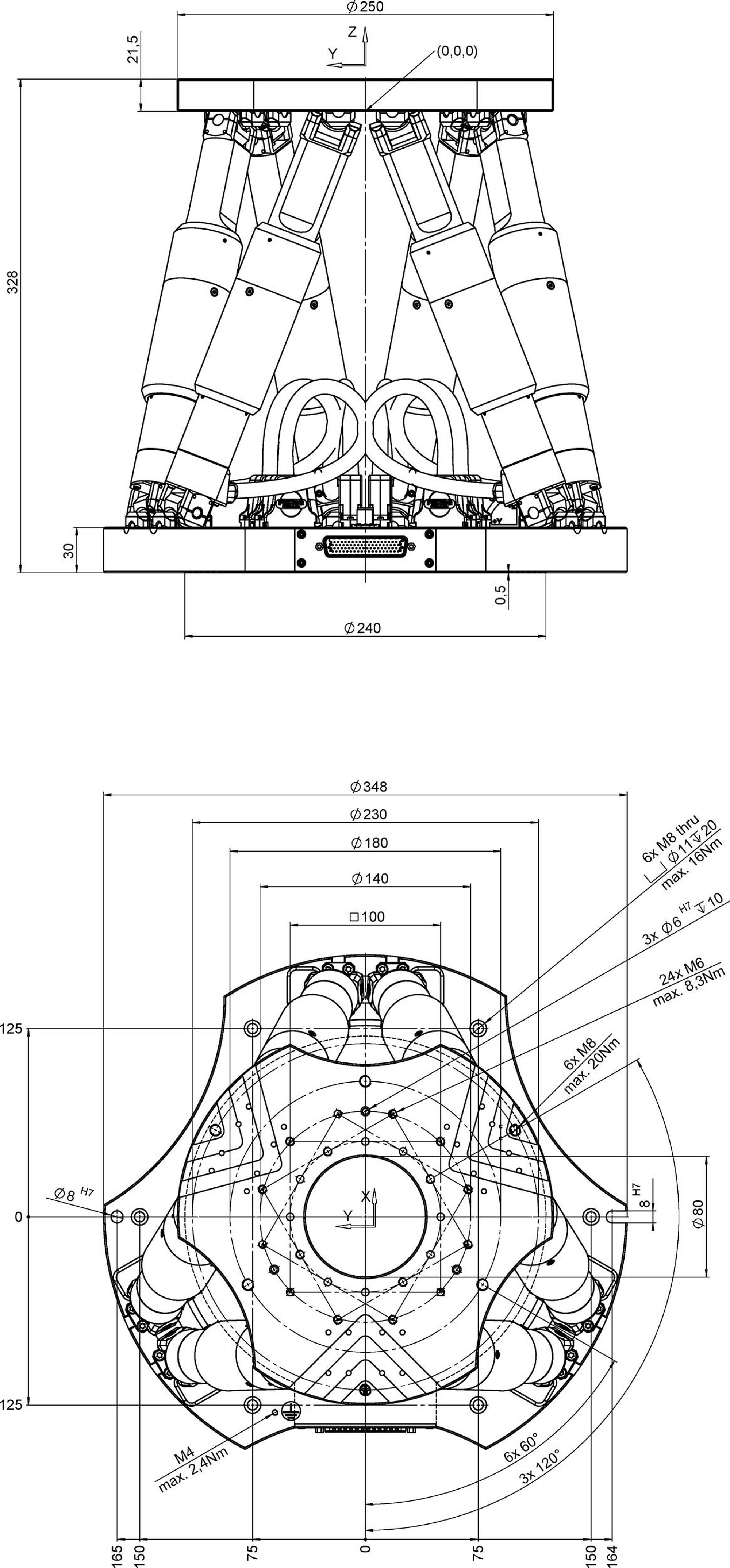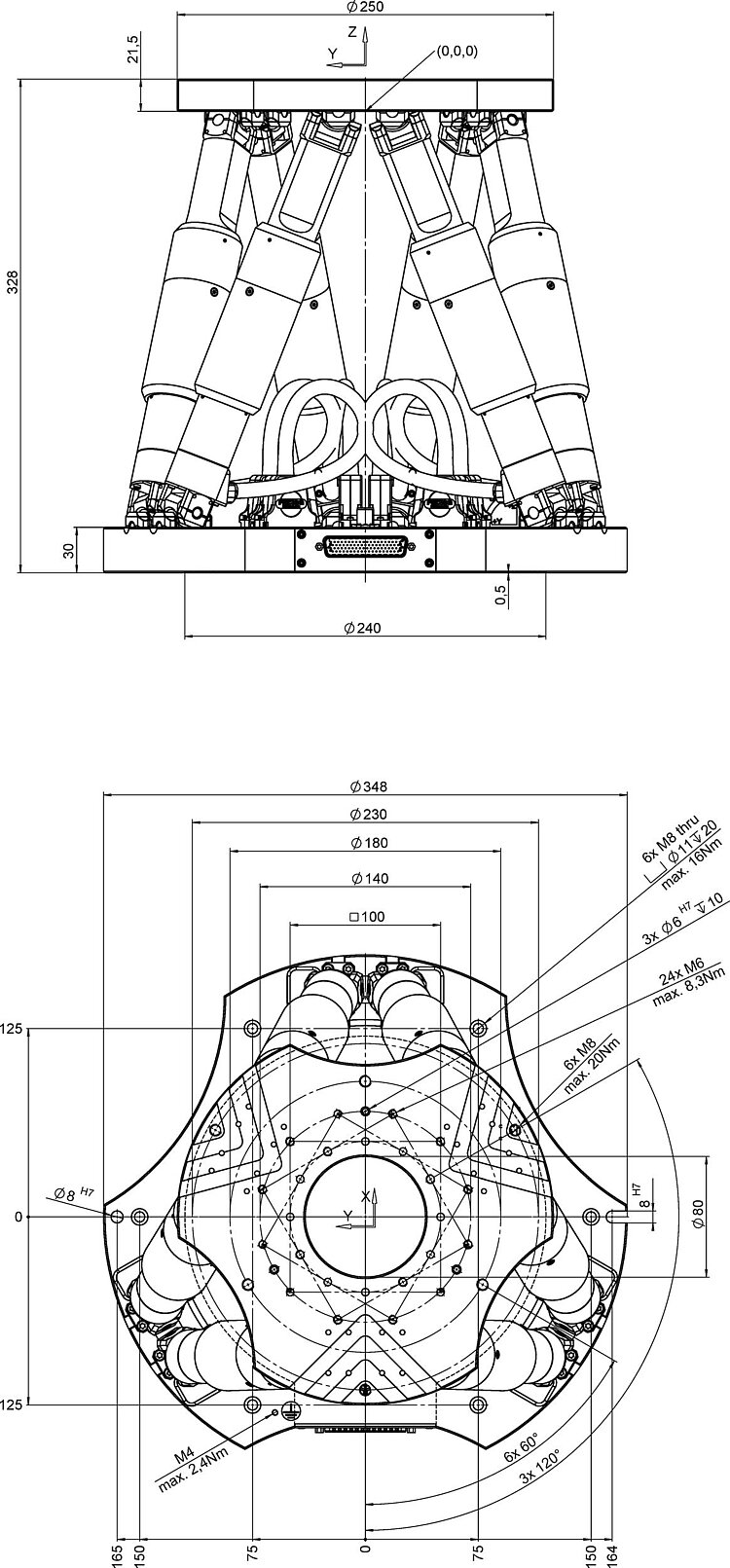 高精度ヘキサポッド、ブラシレスDCギアモーター、アブソリュートエンコーダ、耐荷重:250 kg、最大速度:0.5 mm/s。 接続ケーブルは同梱されていませんので、別途ご注文ください。