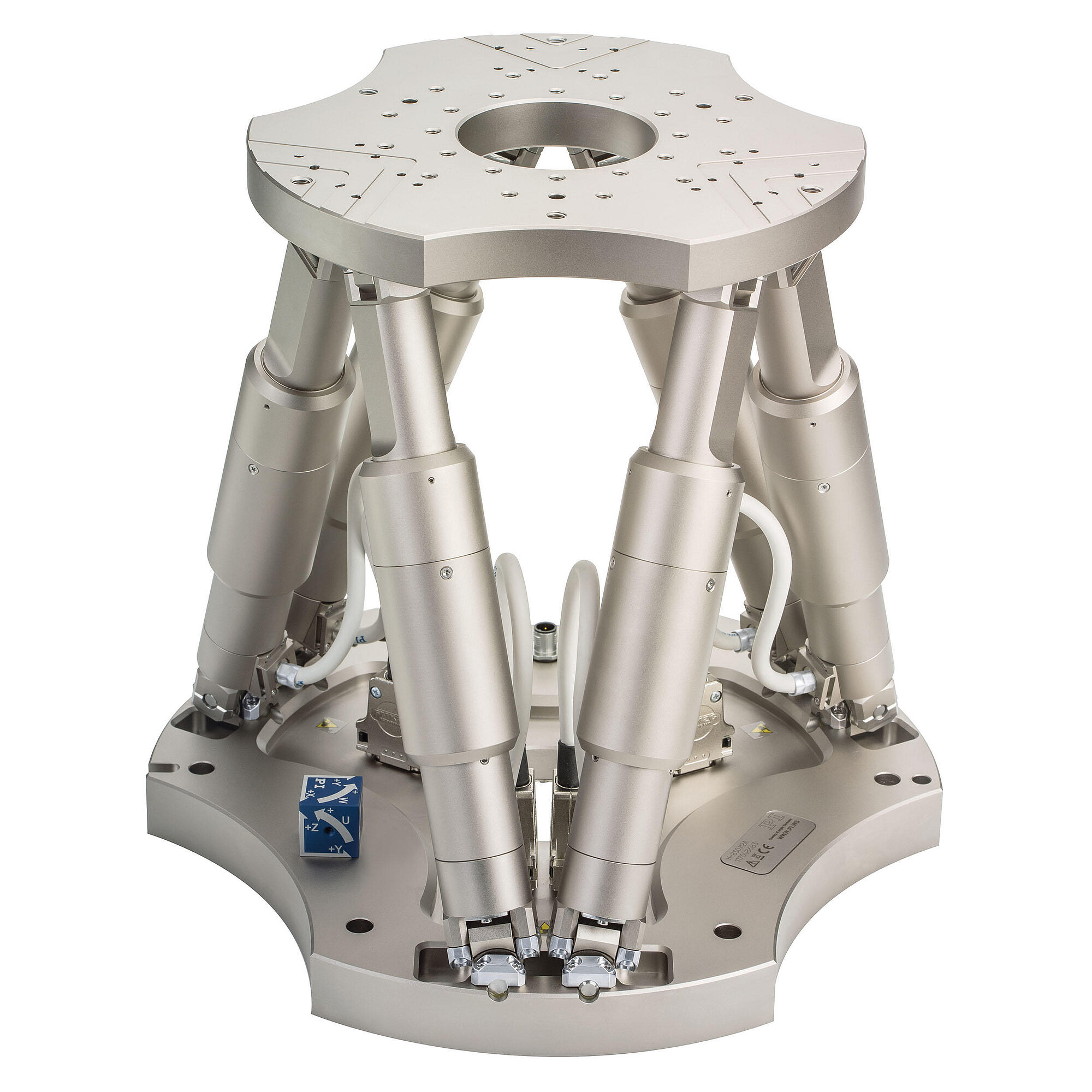 高精度ヘキサポッド、ブラシレスDCギアモーター、アブソリュートエンコーダ、耐荷重:50 kg、最大速度:8 mm/s。 接続ケーブルは同梱されていませんので、別途ご注文ください。