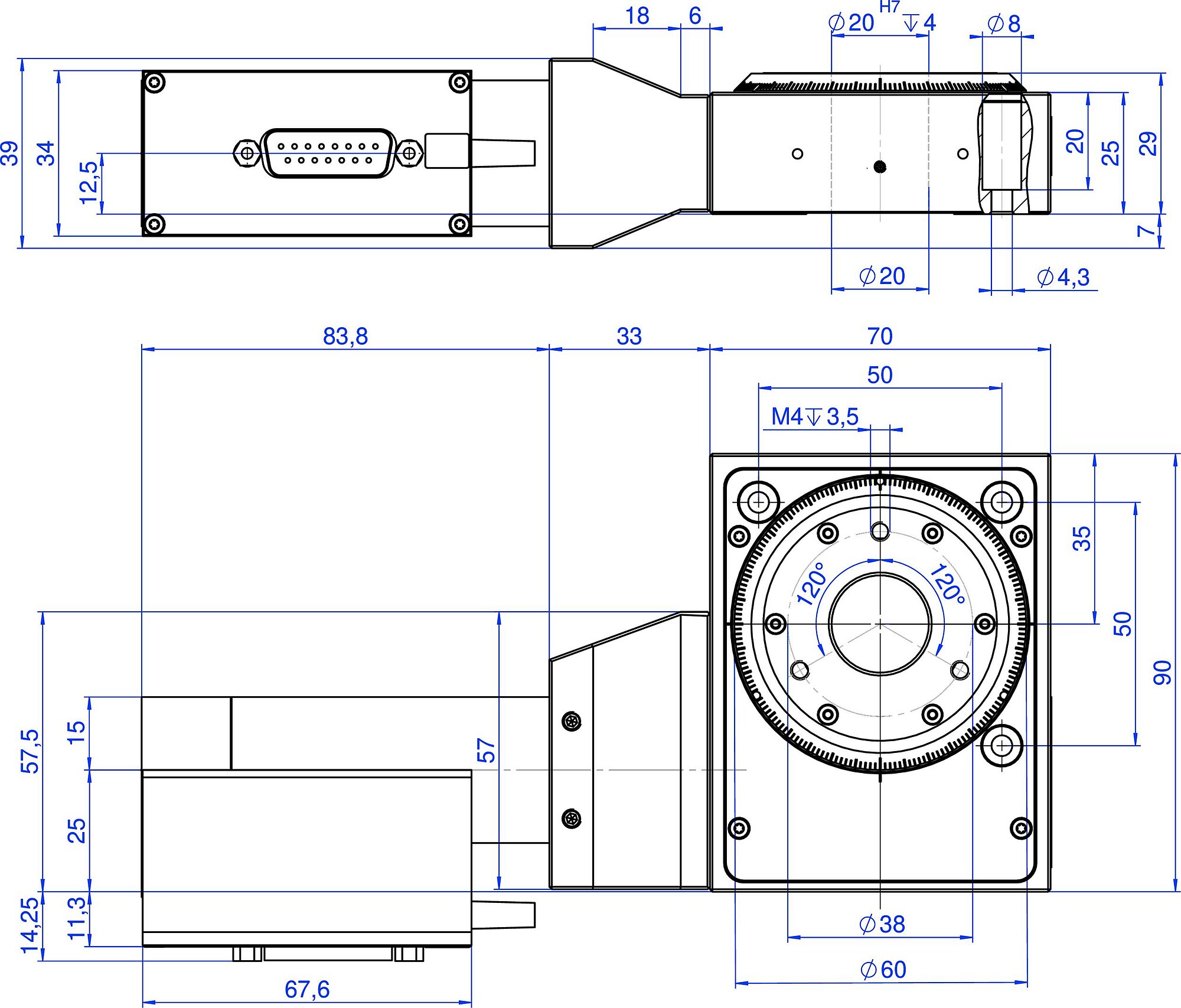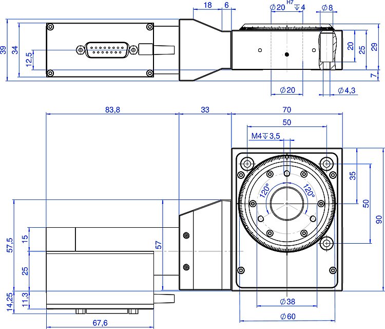 Precision rotation stage, Ø 60 mm, 20 mm Ø aperture, 360°, closed-loop DC gear motor