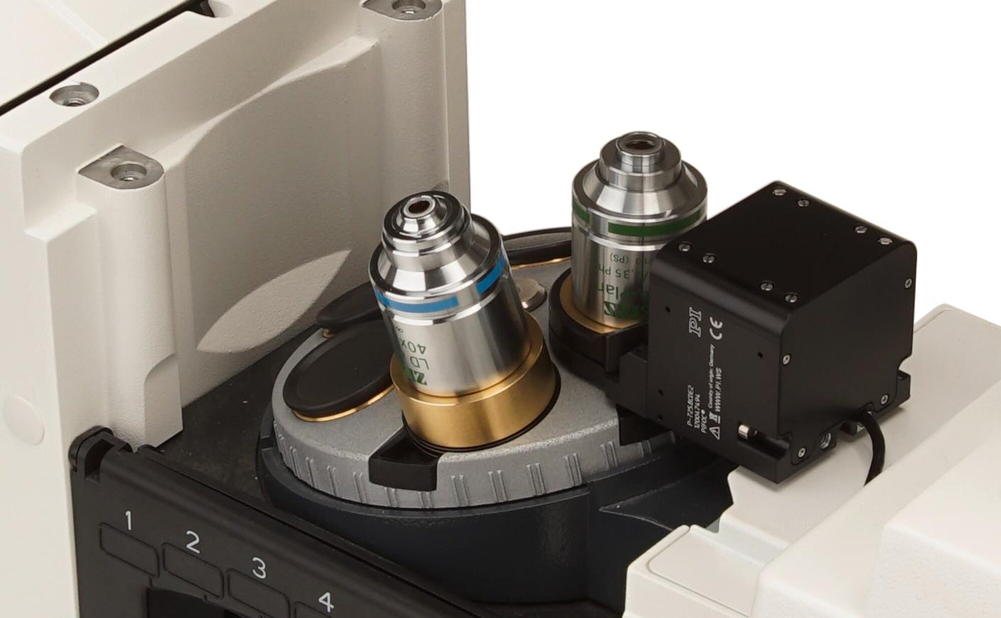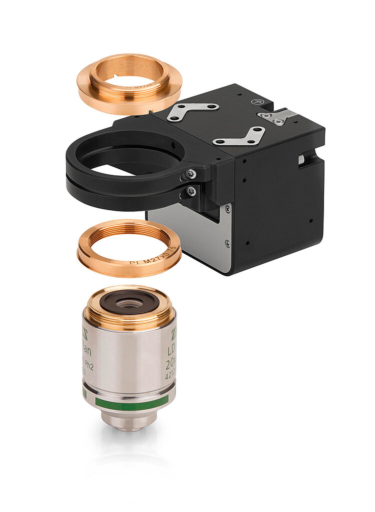 The PIFOC objective positioners are inserted with the thread adapters between the microscope turret and the objective. After the adapter has been screwed into the turret, the PIFOC positioner is orientated as desired and fixed to the adapter. It is not necessary to turn the PIFOC positioner while doing this, which simplifies cable routing.