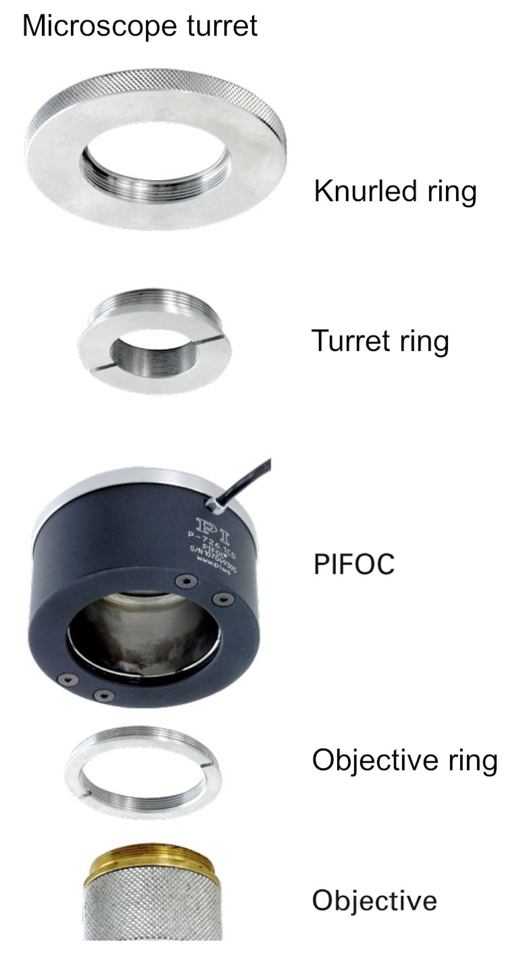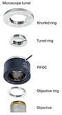 The PIFOC® is inserted between the revolving nosepiece and the objective using the QuickLock fast locking adapter. After screwing the adapter into the revolving nosepiece, the PIFOC® contained is fixed to the desired orientation. Since the objective positioner itself does not have to be rotated, cabling is no longer an issue