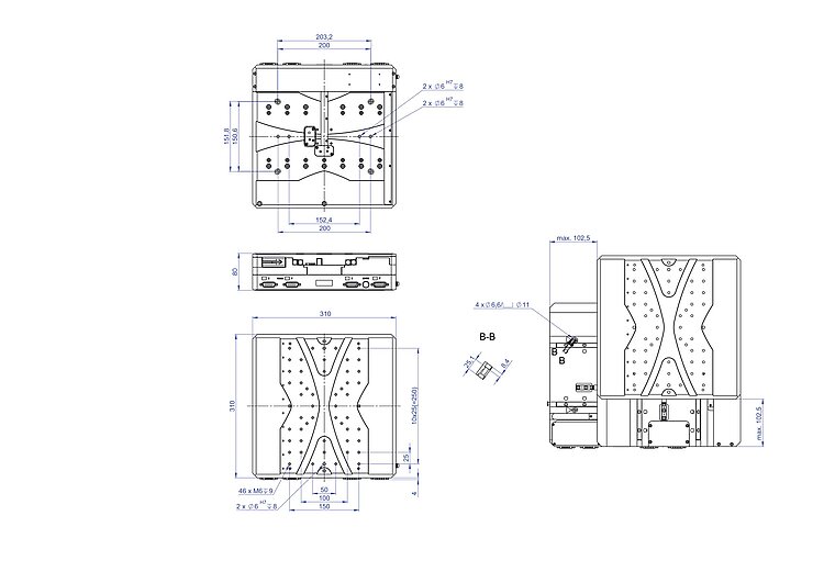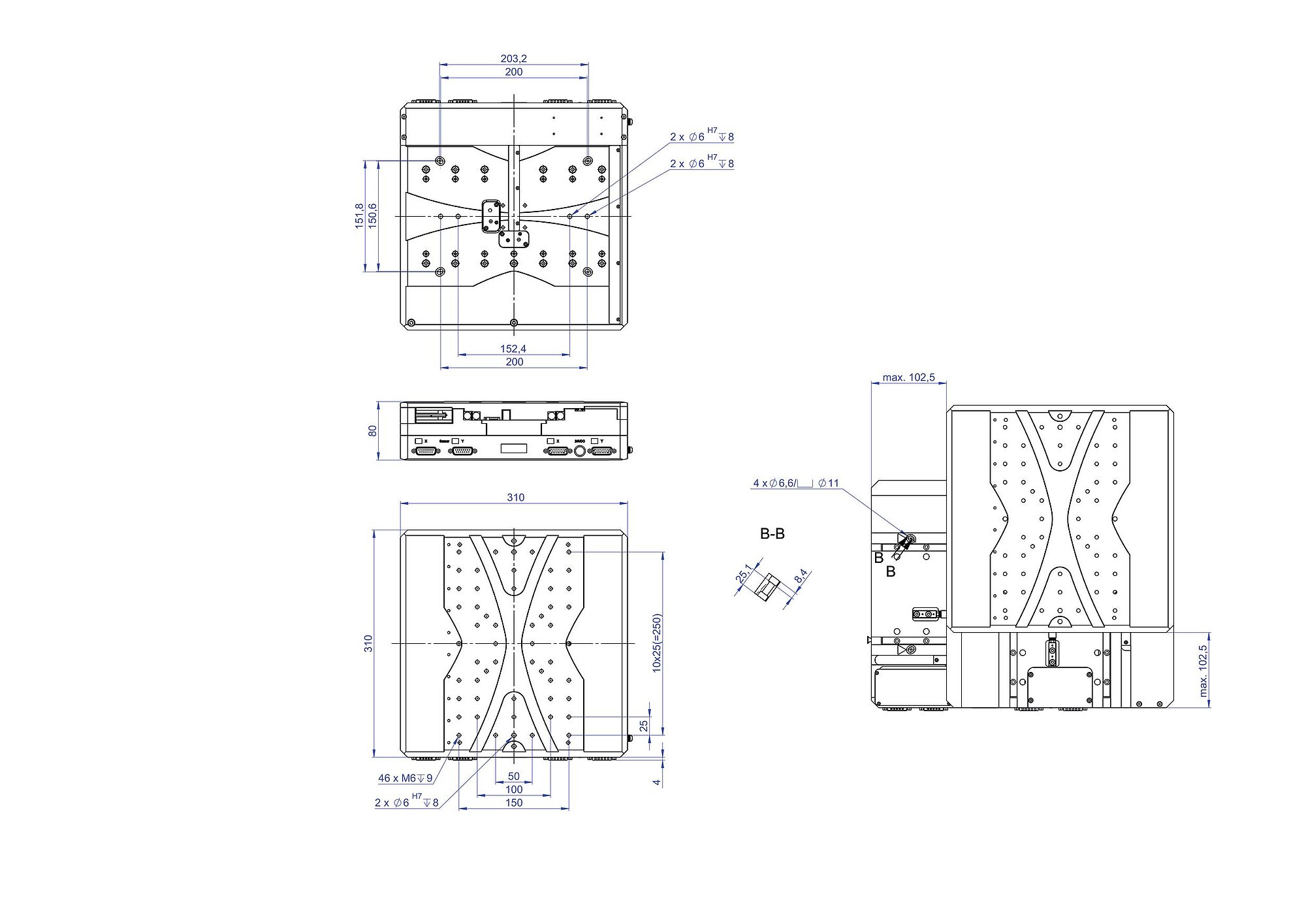 High-precision XY stage, ironless 3-phase linear motor; 205 mm x 205 mm travel range (X × Y); 50 N load capacity; 200 mm/s × 200 mm/s maximum velocity; incremental linear encoder, 20 µm sensor signal period, sin/cos, 1 V peak-peak