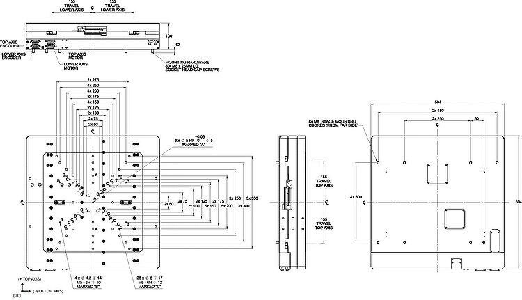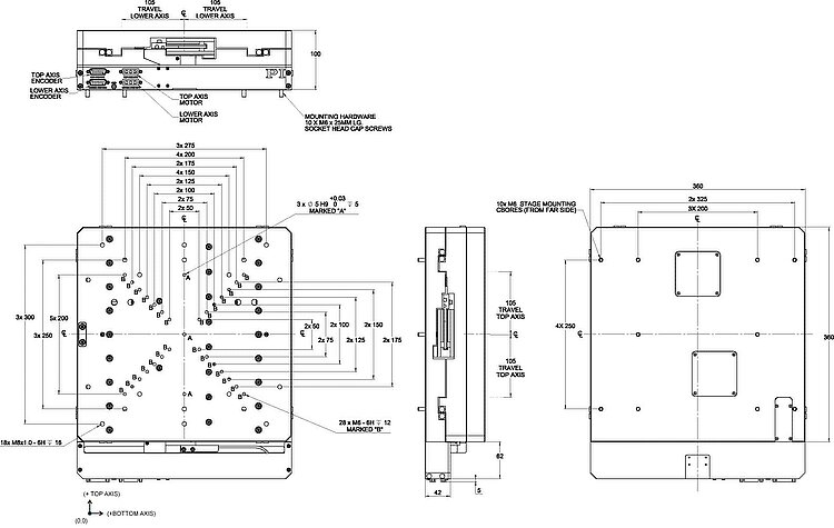 Ultra-precision direct drive XY stage; ironless 3-phase linear motor; 310 mm × 310 mm travel range (X × Y); 500 N load capacity; 1000 mm/s × 1000 mm/s maximum velocity; incremental linear encoder, 1 nm sensor resolution, sin/cos, 1 V peak-to-peak